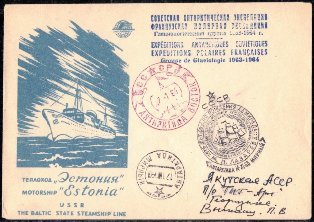 Les 7 et 8 décembre 1963 le navire soviétique « Estonia » chargeait au Havre le matériel et prenait à son bord les 5 scientifiques français qui ne constituaient qu’un détachement de la 9 ème expédition antarctique soviétique pendant que le reste de la mission voguait vers l’Antarctique à bord du brise glace «Ob ».