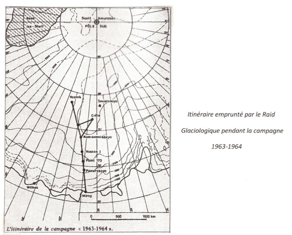 Le convoi a parcouru pendant ce raid 2300 kms dans une température oscillant entre -40º et -70º, à une altitude variant entre 2740m et 3730m rendant les conditions de travail très difficiles. Toutefois 8 mesures de pentagones ont été réalisées : 2 à Vostok du 12 au 14 /2, 1 à Crête le 24/2, 1 à Komsomolskaya du 2/3 au 4/3, 1 à Vostok1 du 12 au 15/3, 1 au Point 173 du 19 au 21/3 et 1 à Pionerskaya du 2 au 24/3/1964. En outre il a été prélevé par carottage 98m,18 de monolithes et carottes dans 7 points différents, 2 à Vostok, un forage à Crête et aux bases Komsomolskaya et Vostok, 2 à la base Pionerskaya.