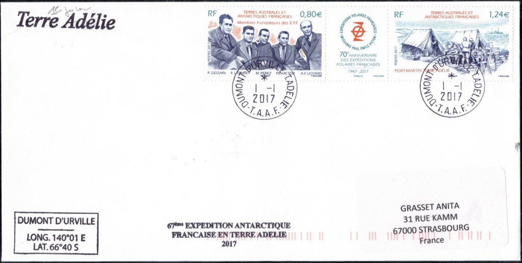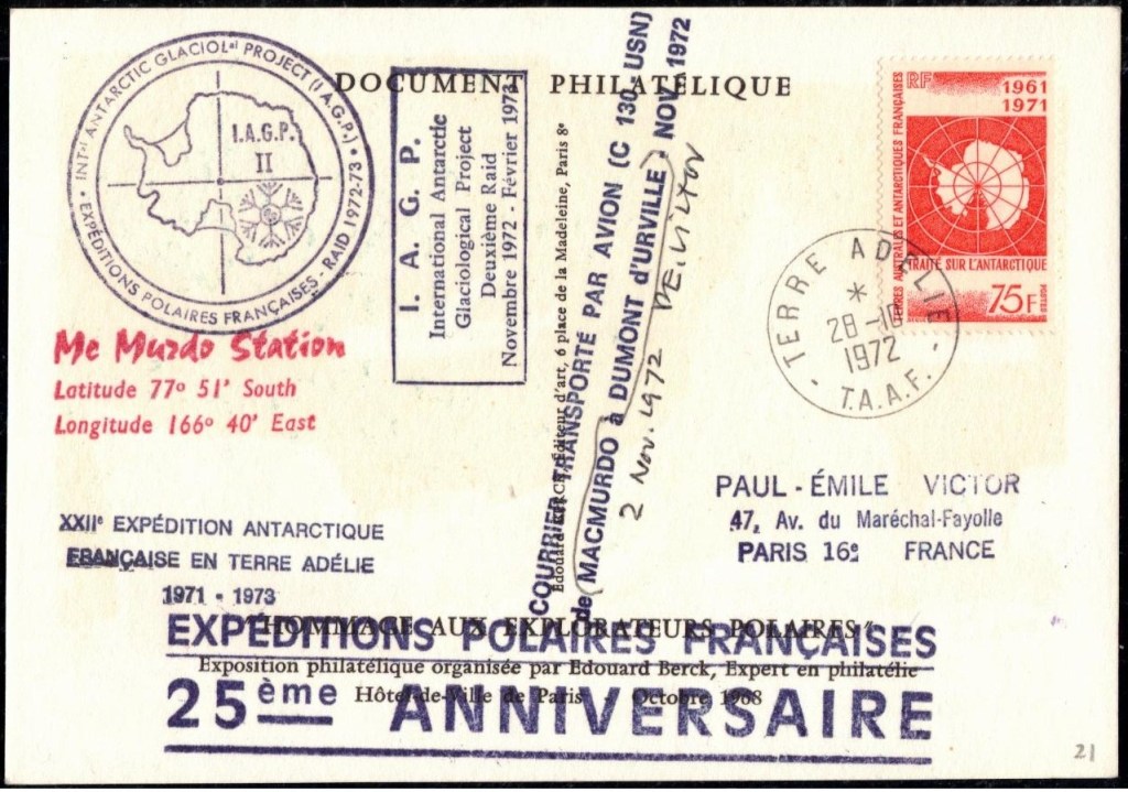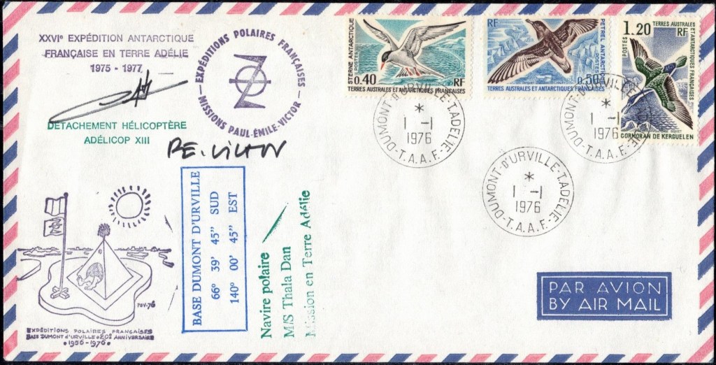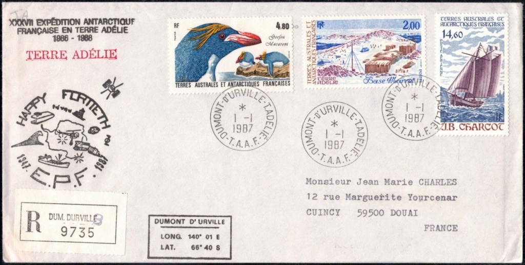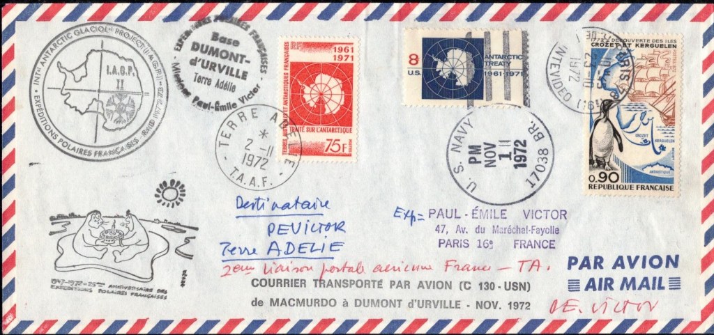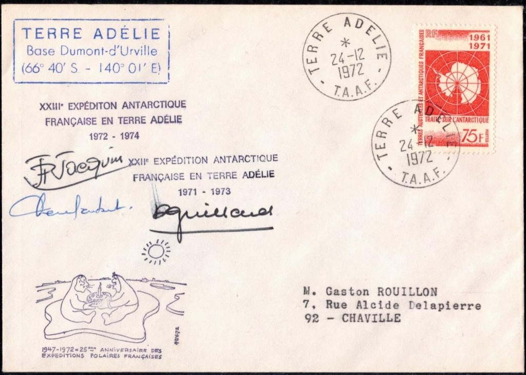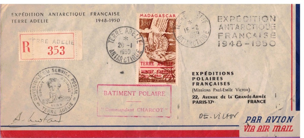 A l’approche du continent antarctique, André-Franck Liotard, nommé gérant postal de cette expédition, décide de commencer la préparation du matériel postal. Il estime que le bateau va atteindre la côte de la Terre Adélie vers le 15 février, et c’est donc cette date qu’il décide d’afficher sur le cachet à date créé spécialement pour le bureau postal de la base. Comme il est conscient que le temps va être compté pour les nombreuses tâches à effectuer une fois arrivé, il décide de commencer à oblitérer les plis philatéliques alors que l’expédition est toujours en mer. En plus des plis de la souscription Lafon, il y les nombreux plis philatéliques et quelques rares cartes postales privés (revêtus du timbre « Zéphyr » ou de timbres malgaches) et ceux de l’équipage du « Commandant Charcot » (qui doivent se limiter à trois plis par personne, affranchis du timbres « Zéphyr« ) et des membres de l’expédition.