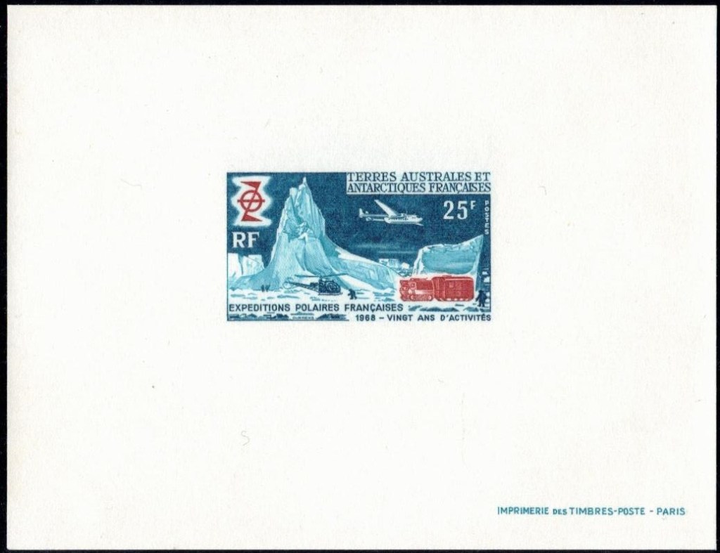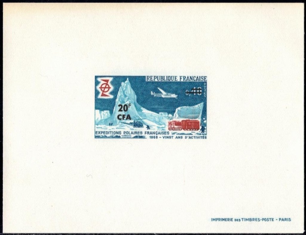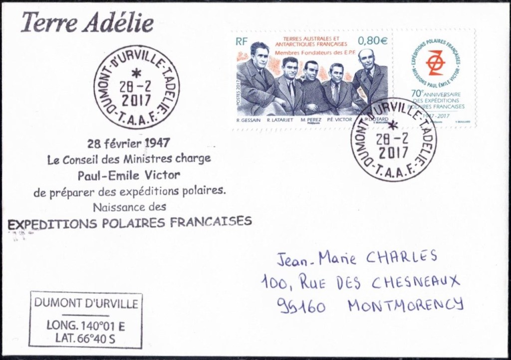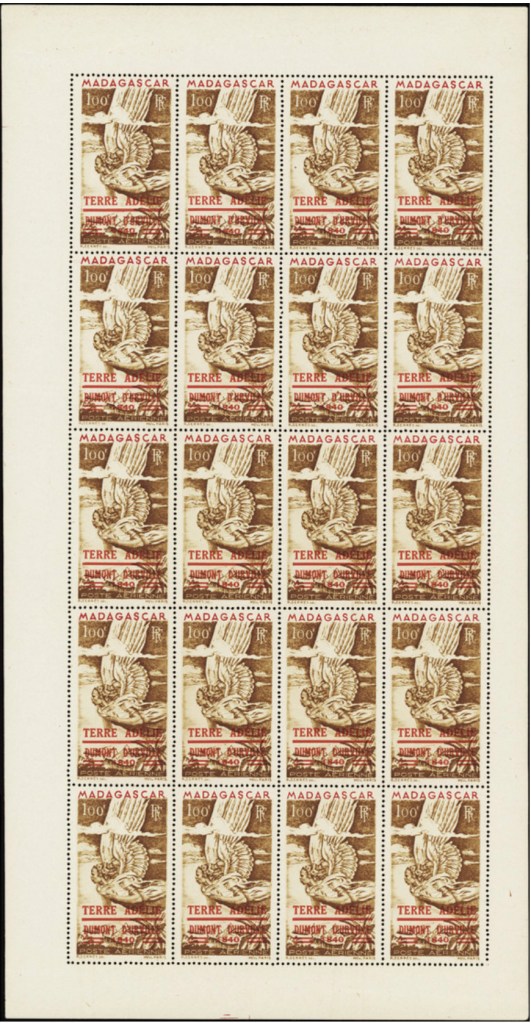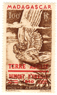 Pour commémorer et accompagner (on dirait aujourd’hui « médiatiser ») cette mission de reprise de possession de la Terre Adélie par la France, Paul-Emile Victor, qui a de nombreux appuis dans les cercles des gouvernants, milite pour l’émission d’un timbre poste marquant cet événement. Il obtient partiellement satisfaction et un timbre de Madagascar (le 100 F. « Zéphyr« ) est surchargé en rouge de la mention « TERRE ADELIE – DUMONT D’URVILLE – 1840« . 200.000 timbres seront surchargés, et mis en vente à l’Agence des Timbres-Poste d’Outre-Mer à partir du 26 octobre 1948, au prix de 200 francs. Ironie de l’histoire, le bureau de poste de Terre Adélie ne sera officiellement créé que le 24 novembre suivant…