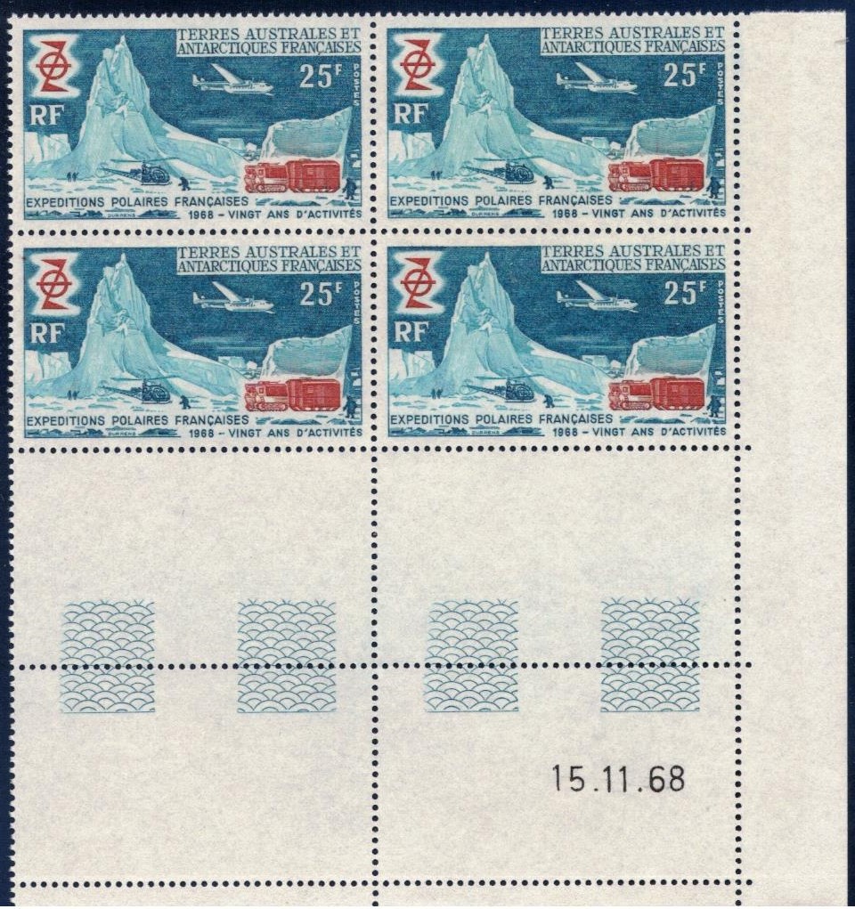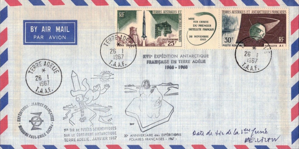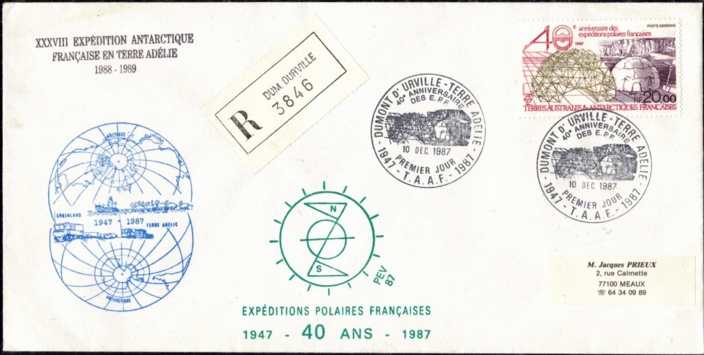 – une enveloppe affranchie du timbre « Zéphyr » surchargé, oblitérée de la date d’arrivée du « Commandant Charcot » en Terre Adélie avec le nouveau cachet à date créé pour la circonstance. Un cachet spécial à l’effigie de Dumont d’Urville sera apposé sur ces enveloppes. Ces plis doivent rentrer en France dès la fin de la première expédition. Le prix est de 1000 francs.