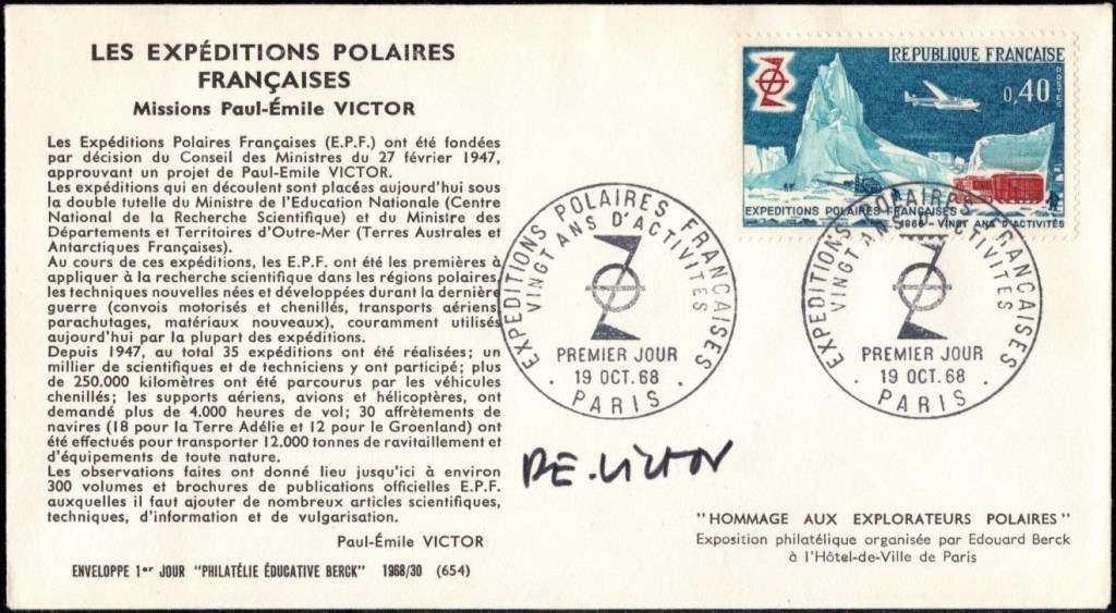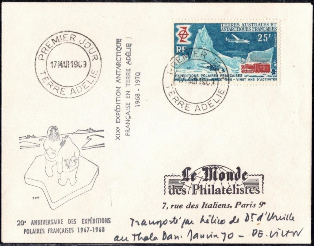 Bien entendu, cette nouvelle aventure ne laisse pas les philatélistes indifférents. Le principal artisan de la réalisation des premiers plis philatéliques de Terre Adélie est M. Arthur Lafon, directeur du mensuel philatélique « Le Timbre », qui apprend la nouvelle de l’émission de ce timbre aux collectionneurs.