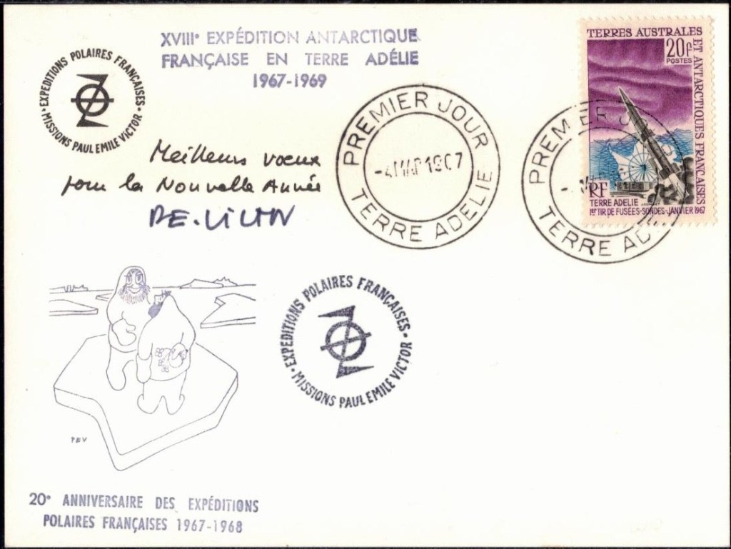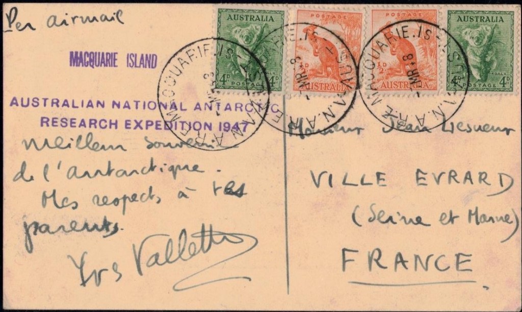 Egalement, Yves valette, le second l’expédition conduite par Franck Liotard, part de France en novembre 1947 comme observateur auprès d’une expédition australienne qui va établir une base sur l’île de Macquarie située à mi distance entre la Tasmanie et la Terre Adélie. Cette mission doit ainsi permettre de se familiariser avec les problème de création d’une base en Antarctique. Il a envoyé quelques cartes à des proches dont l’exemplaire ci-dessous (8 exemplaires connus). Il rentrera au printemps 1948.