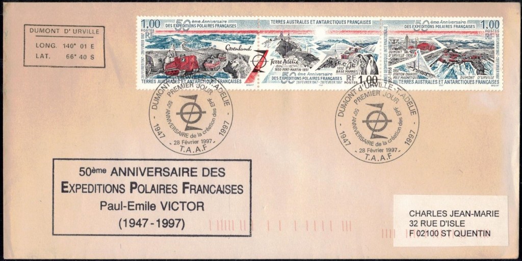 La plupart de ces enveloppes portent un en-tête intitulé « EXPEDITION ANTARCTIQUE FRANÇAISE – TERRE ADÉLIE – 1948-1950« . Celle qui ne portent pas cet en-tête seront revêtues du cachet des E.P.F. « Expéditions Arctiques – Expéditions Antarctiques« .