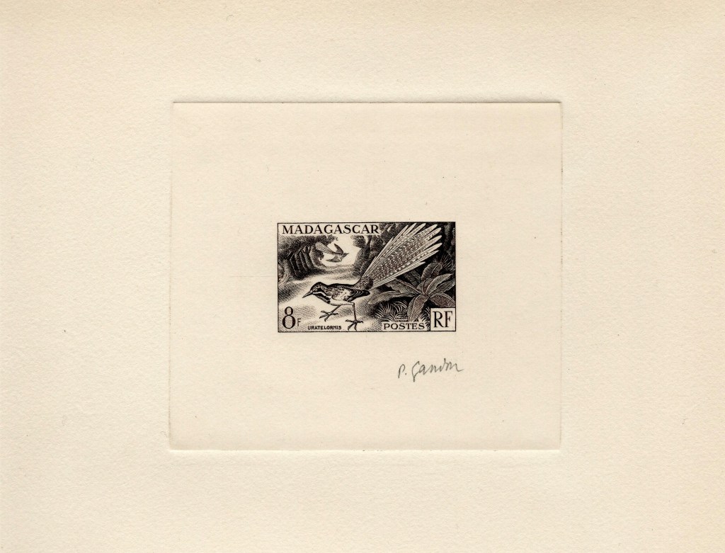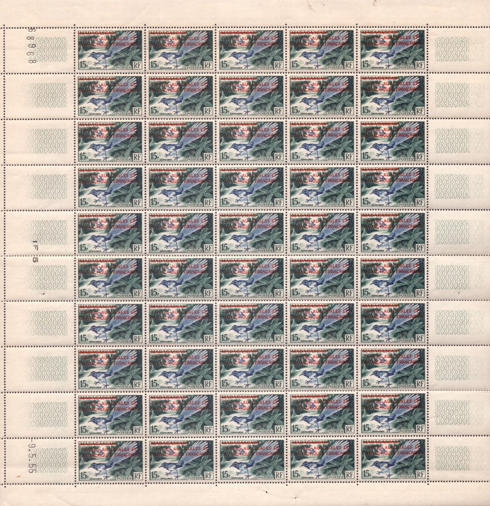 Le Territoire des T.A.A.F. étant devenu autonome, il se voit doté d’un service postal distinct de celui de Madagascar, et cela se traduit dès 1955 par l’émission d’un timbre spécifique au territoire. Comme pour le timbre « Zéphyr« , il s’agira d’un timbre de Madagascar surchargé. Cette fois-ci ce sera le timbre à 15 F. consacré à l’oiseau URATELORNIS (n° Yvert 324 de Madagascar) qui sera surchargé en rouge « TERRES AUSTRALES ET ANTARCTIQUES FRANCAISES« , la mention MADAGASCAR étant barrée.