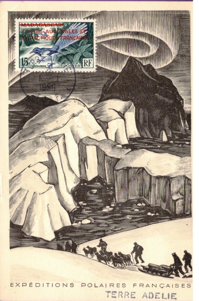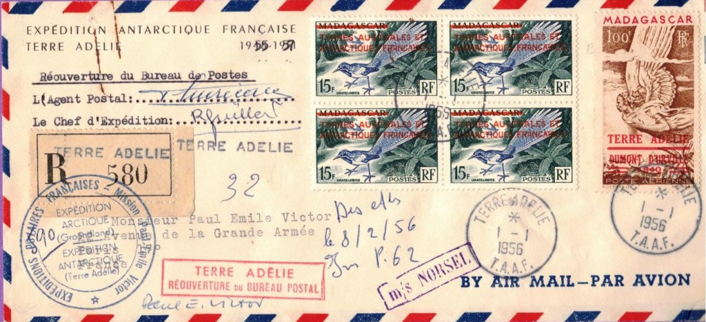 Cette date du 1-1-56 est la seule existante pour l’année 1956. Les plis suivants seront oblitérés de 1957, qui a été une année riche à la fois au point de vue philatélique, mais aussi scientifique, avec le début de l’Année Géophysique Internationale.