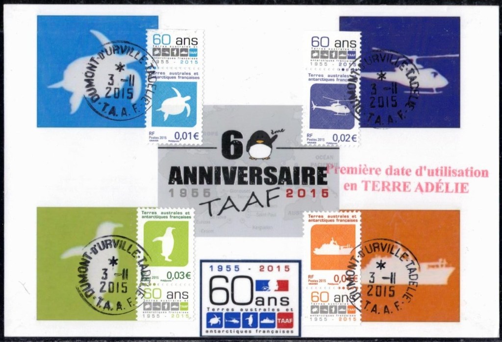Le premier jour d’utilisation de ce timbre sera symboliquement le jour du débarquement, le 1er janvier 1956. Cette date est donc le Premier Jour d’utilisation du premier timbre T.A.A.F. en Terre Adélie. Les plis portant cette oblitération sont assez rares et très intéressants. On en trouve avec le timbre URATELORNIS seul, mais aussi associé à des timbres de Madagascar.