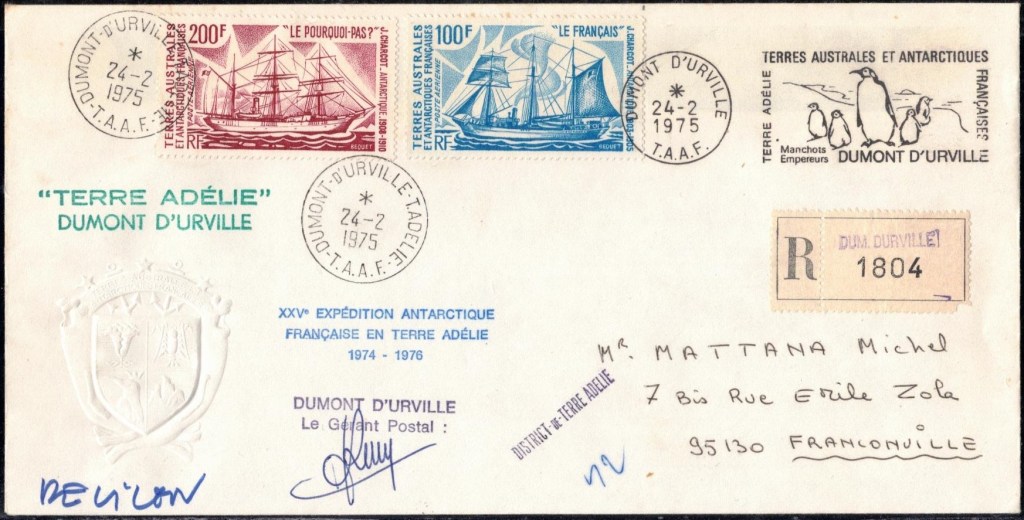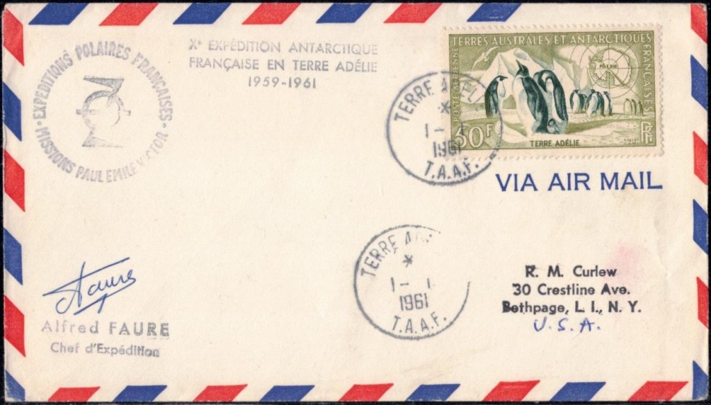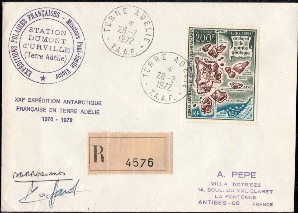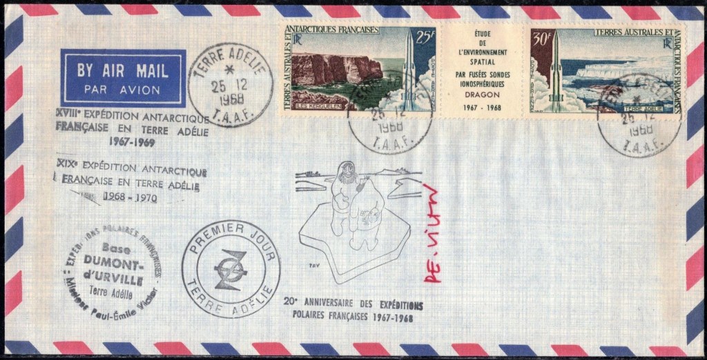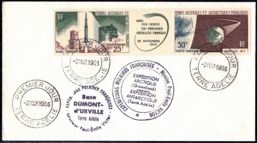 Pli signé par Alfred Faure, chef d’expédition cette année là, peu de temps avant sa mort.Oblitération premier jour du triptyque le 2 mars 1966Commémoration du premier lancement de satellite français le 1er janvier 1967Oblitération premier jour du triptyque fusée DragonPremier jour des timbres émis en 1969