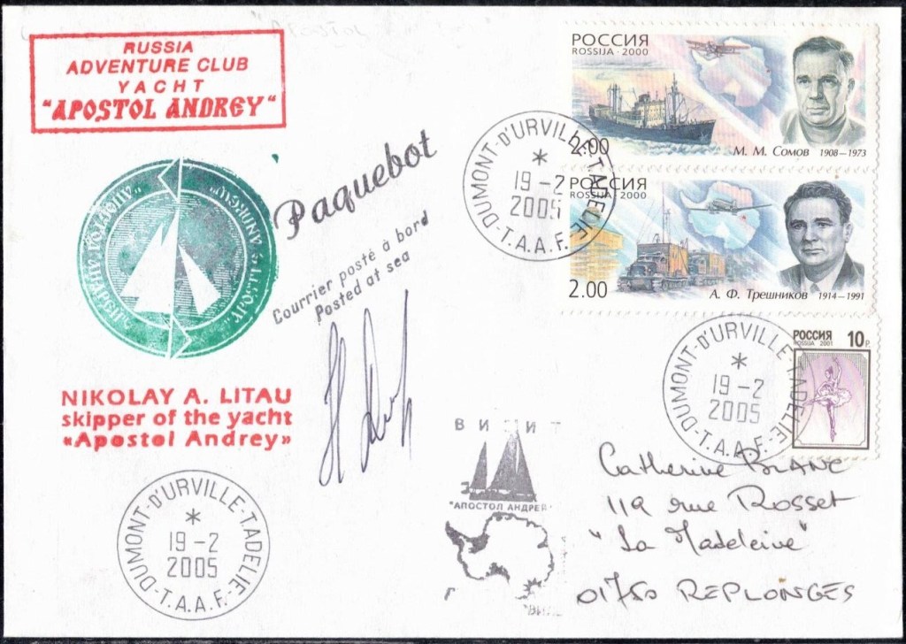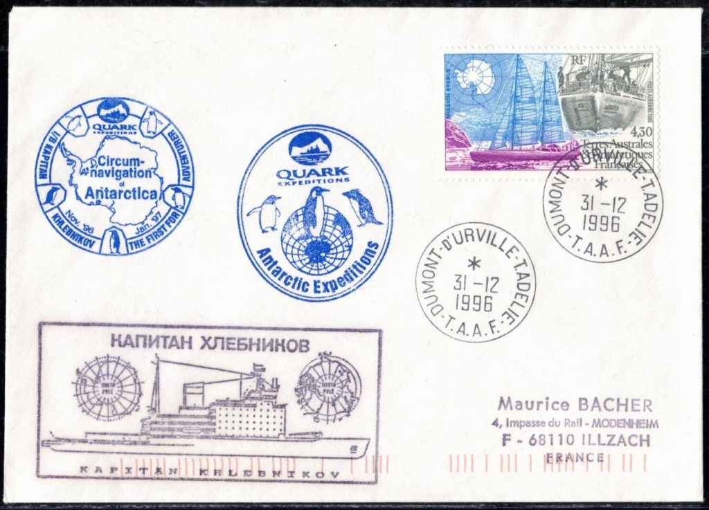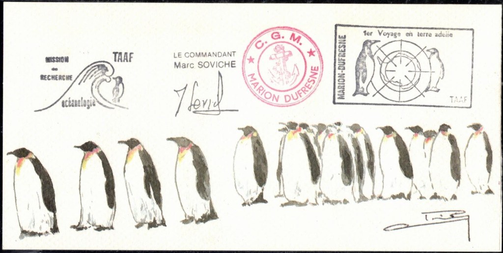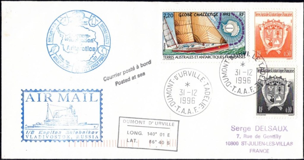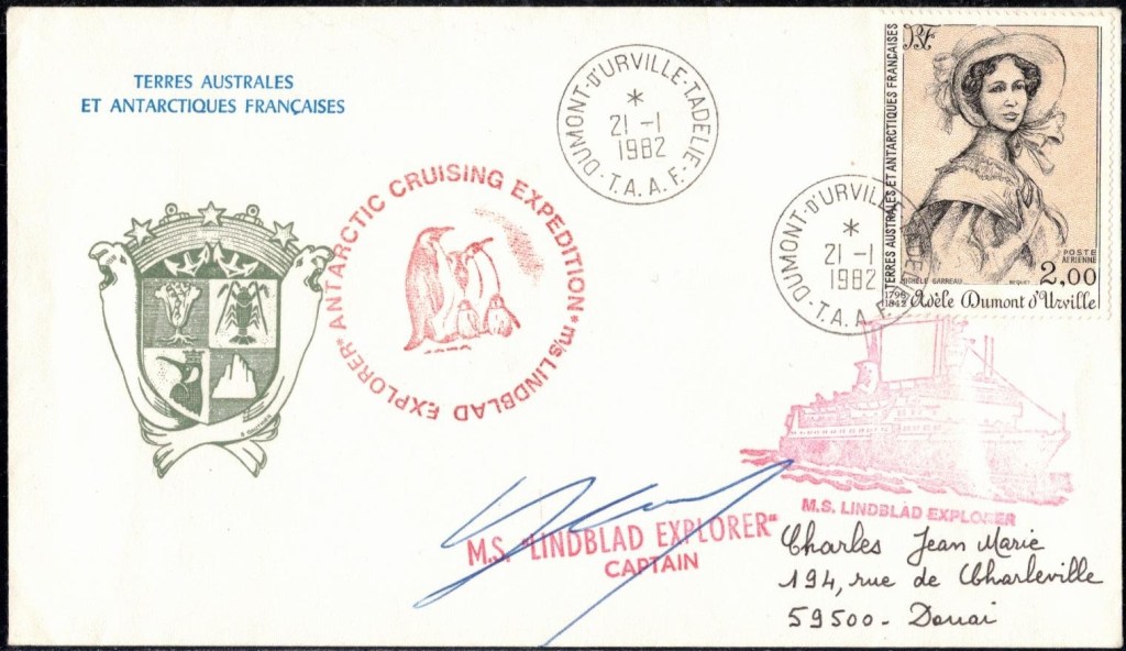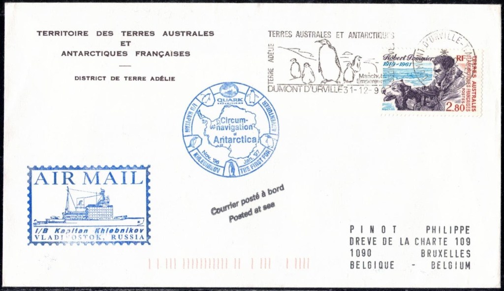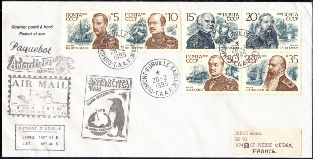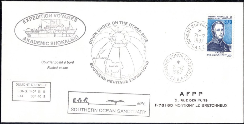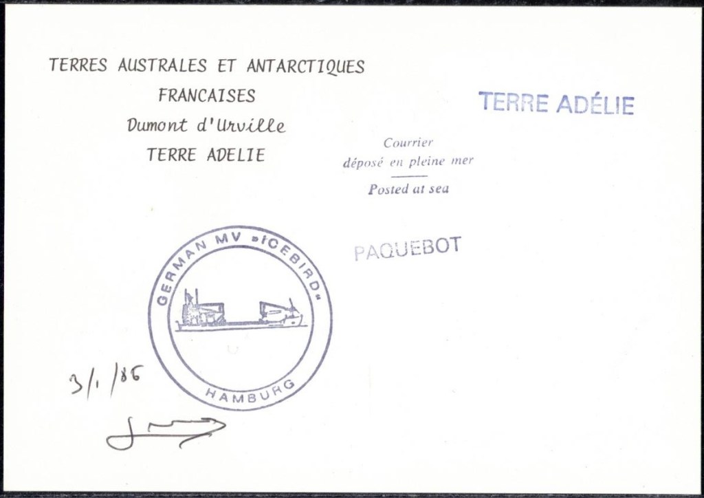 Lettre oblitérée lors du passage du navire soviétique Ob (voir missions glaciologiques Vostok)Lettre oblitérée lors du passage du navire US STATEN ISLAND et repartie par le Thala DanLettre oblitérée lors du passage du SV EXPLORA, navire de recherche géophysiqueLettre oblitérée lors du passage du MS LINDBLAD EXPLORER, navire de croisières Lettre oblitérée lors du passage du DICK SMITH EXPLORER le 8 février 1982Passage du Polar Star en mission d’inspection du respect du traité sur l’antarctique, terre adélie 28 janvier 1983Pli oblitéré à bord du Polar Star début février 1983 lors de sa mission d’inspectionLettre oblitérée lors du second passage du DICK SMITH EXPLORER le 1er janvier 1985Lettre oblitérée lors du passage du SOUTHERN QUESTPassage du Southern Quest en terre Adélie le 11 décembre 1985 (expédition Australienne) peu avant son naufrageLettre déposée et oblitérée lors du passage du Southern Quest à Dumont D’Urville avec retour par L’IcebirdLettre oblitérée lors du passage du navire allemand MV ICEBIRDPli du 3 janvier 1986 oblitéré lors du passage de l’Icebird et sa carte signée du commandantLettre oblitérée lors du passage du navire Danois MS NELLA DANLettre oblitérée lors du passage du premier passage du MARION DUFRESNE, habituel ravitailleur des îles australes françaisesAvec les cachets de la campagne océanographique objet de ce voyageCarte illustrée signée du commandant du Marion Dufresne en recto versoLettre oblitérée lors du passage du navire de Greenpeace lLettre oblitérée lors du passage du navire de Greenpeace le 14 janvier 1989Passage du navire de Greenpeace le 22 janvier 1990Lettre oblitérée lors du passage du MS FRONTIER SPIRIT, navire de croisièresLettre oblitérée lors du second passage de l’ICEBIRD le 2 novembre 1993Lettre oblitérée lors du passage du navire australien AURORA AUSTRALISNouveau passage d’inspection du navire US POLAR STAR le 17 février 1995Lettre oblitérée lors du premier passage du navire russe KAPITAN KHLEBNIKOVAvec erreur de date sur la flamme 31 décembre 1990Lettre oblitérée lors du second passage du navire russe KAPITAN KHLEBNIKOVLettre oblitérée lors du passage du navire russe AKADEMIC SHOKALSKILettre oblitérée lors du troisième passage du navire russe Kapitan Khlebnikov avec erreur sur l’un des timbres à datePassage du navire russe « Marina Svetaeva »