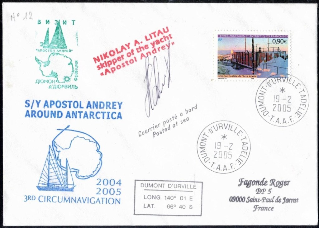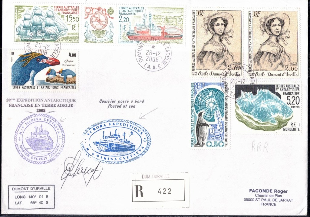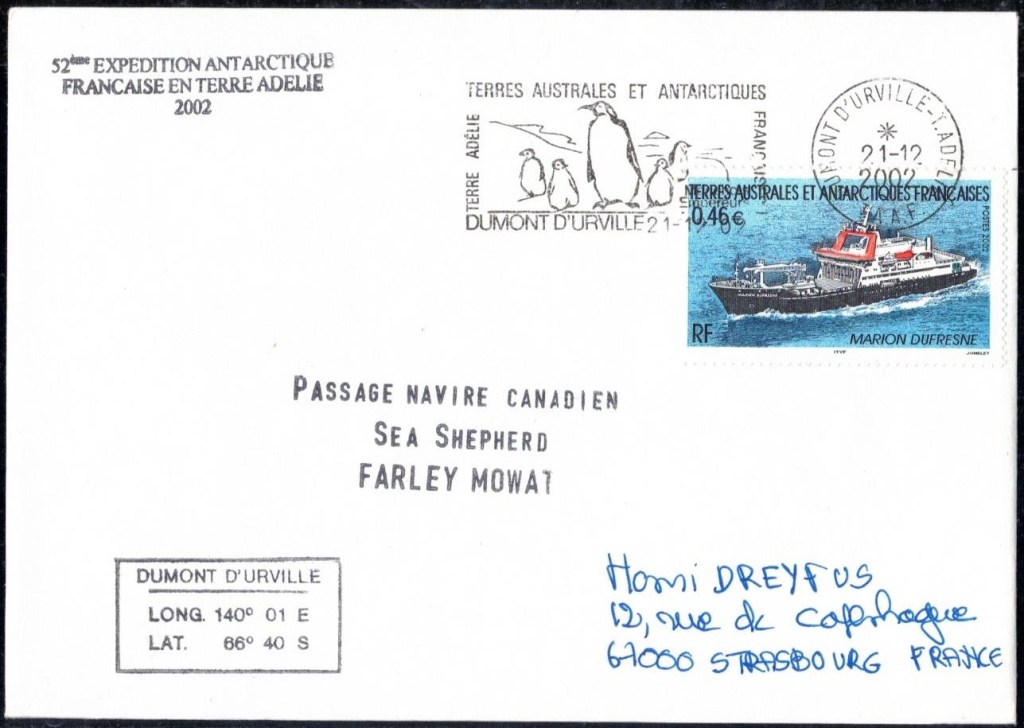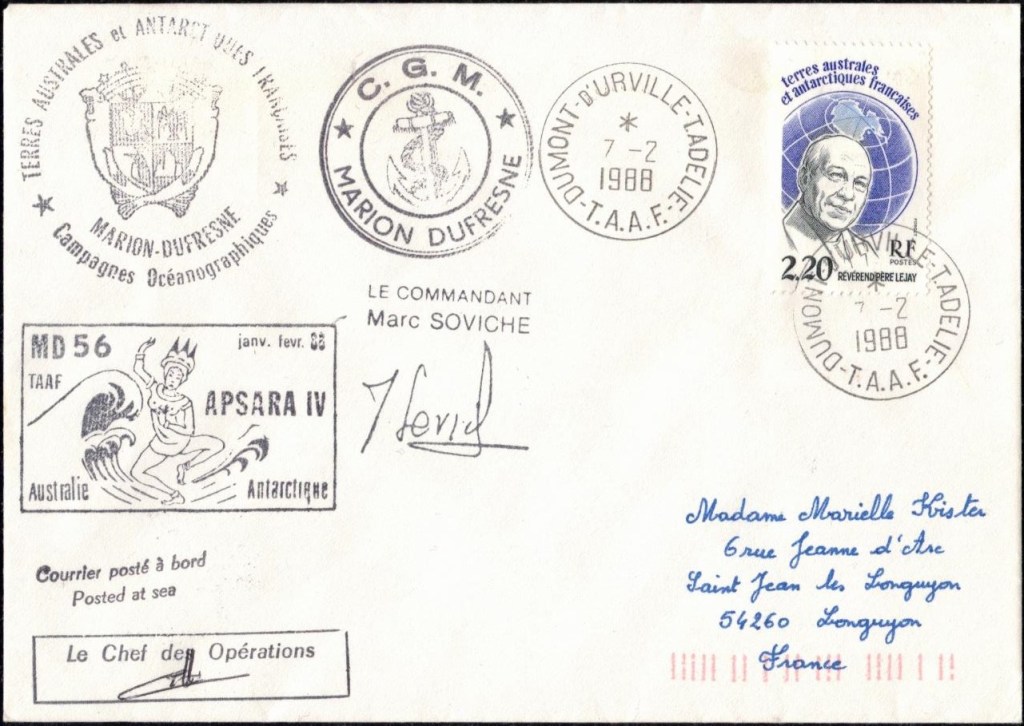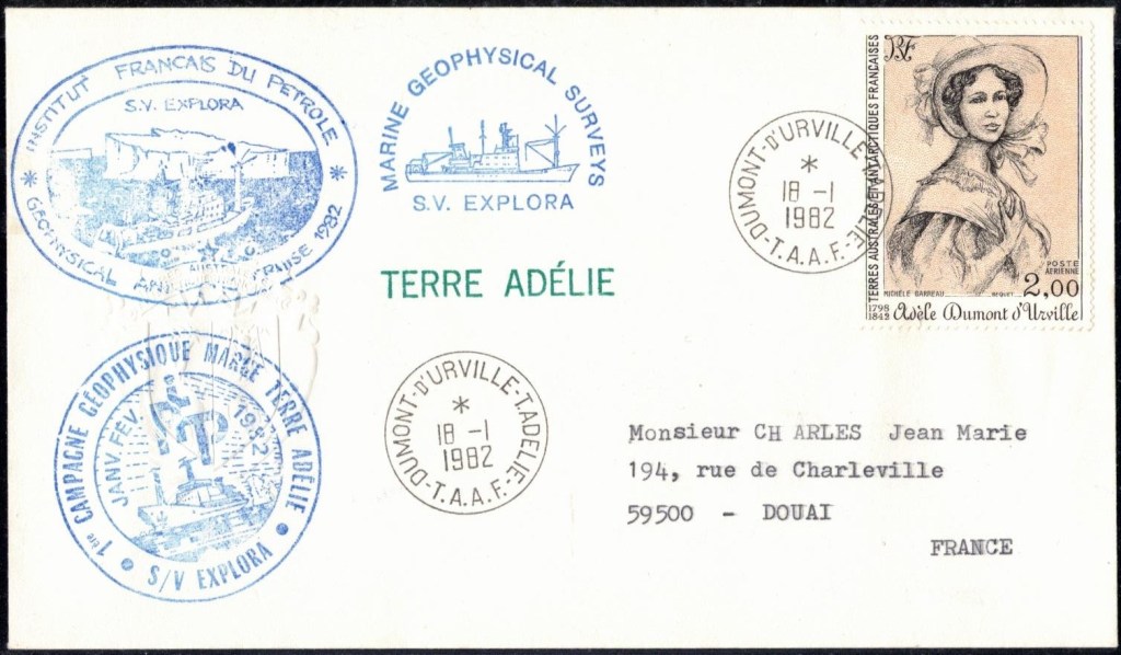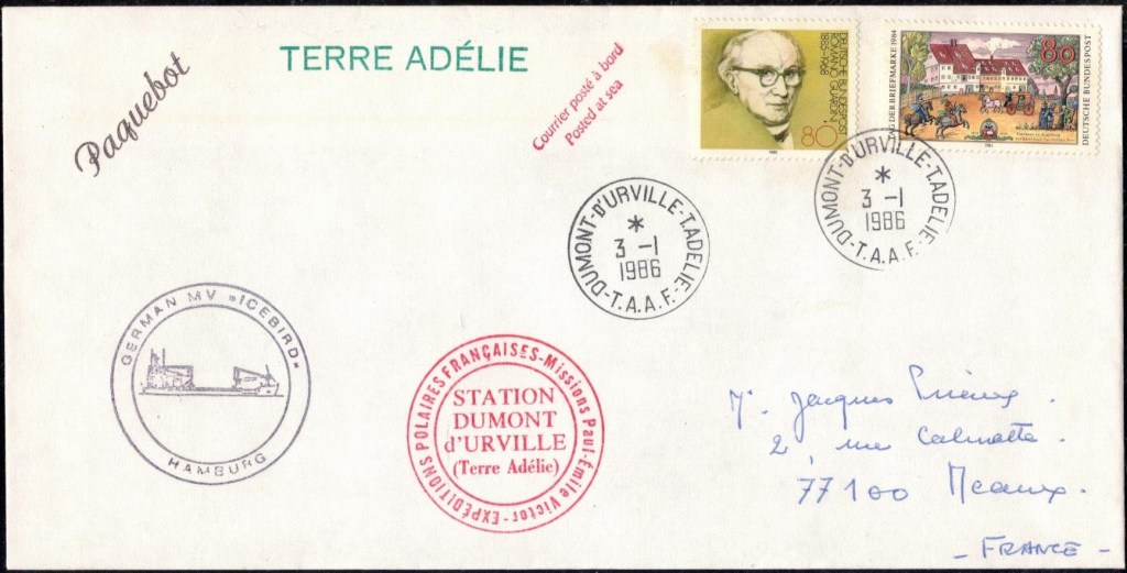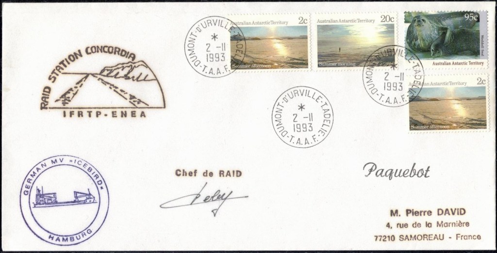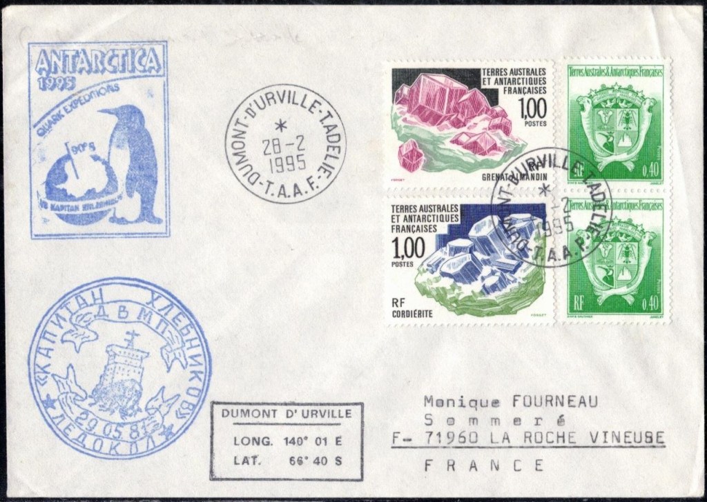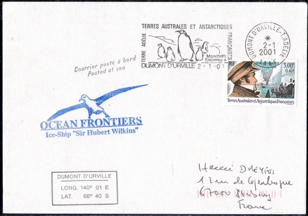 Lettre oblitérée lors du passage du navire soviétique Ob (voir missions glaciologiques Vostok)Lettre oblitérée lors du passage du navire US STATEN ISLAND et repartie par le Thala DanLettre oblitérée lors du passage du SV EXPLORA, navire de recherche géophysiqueLettre oblitérée lors du passage du MS LINDBLAD EXPLORER, navire de croisières Lettre oblitérée lors du passage du DICK SMITH EXPLORER le 8 février 1982Passage du Polar Star en mission d’inspection du respect du traité sur l’antarctique, terre adélie 28 janvier 1983Pli oblitéré à bord du Polar Star début février 1983 lors de sa mission d’inspectionLettre oblitérée lors du second passage du DICK SMITH EXPLORER le 1er janvier 1985Lettre oblitérée lors du passage du SOUTHERN QUESTPassage du Southern Quest en terre Adélie le 11 décembre 1985 (expédition Australienne) peu avant son naufrageLettre déposée et oblitérée lors du passage du Southern Quest à Dumont D’Urville avec retour par L’IcebirdLettre oblitérée lors du passage du navire allemand MV ICEBIRDPli du 3 janvier 1986 oblitéré lors du passage de l’Icebird et sa carte signée du commandantLettre oblitérée lors du passage du navire Danois MS NELLA DANLettre oblitérée lors du passage du premier passage du MARION DUFRESNE, habituel ravitailleur des îles australes françaisesAvec les cachets de la campagne océanographique objet de ce voyageCarte illustrée signée du commandant du Marion Dufresne en recto versoLettre oblitérée lors du passage du navire de Greenpeace lLettre oblitérée lors du passage du navire de Greenpeace le 14 janvier 1989Passage du navire de Greenpeace le 22 janvier 1990Lettre oblitérée lors du passage du MS FRONTIER SPIRIT, navire de croisièresLettre oblitérée lors du second passage de l’ICEBIRD le 2 novembre 1993Lettre oblitérée lors du passage du navire australien AURORA AUSTRALISNouveau passage d’inspection du navire US POLAR STAR le 17 février 1995Lettre oblitérée lors du premier passage du navire russe KAPITAN KHLEBNIKOVAvec erreur de date sur la flamme 31 décembre 1990Lettre oblitérée lors du second passage du navire russe KAPITAN KHLEBNIKOVLettre oblitérée lors du passage du navire russe AKADEMIC SHOKALSKILettre oblitérée lors du troisième passage du navire russe Kapitan Khlebnikov avec erreur sur l’un des timbres à datePassage du navire russe « Marina Svetaeva »