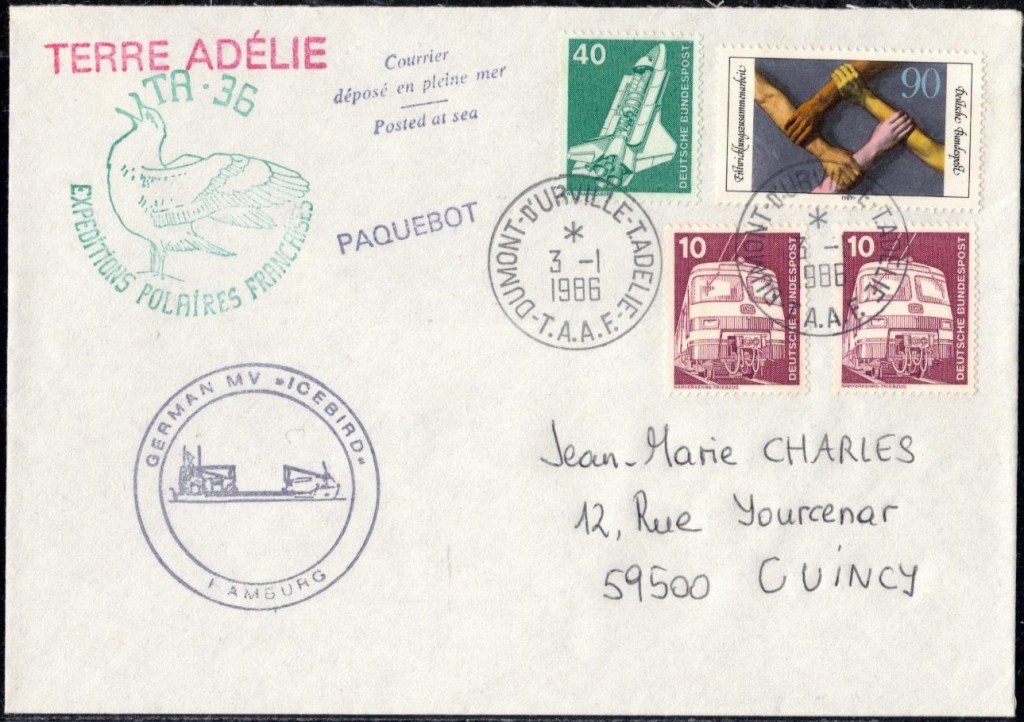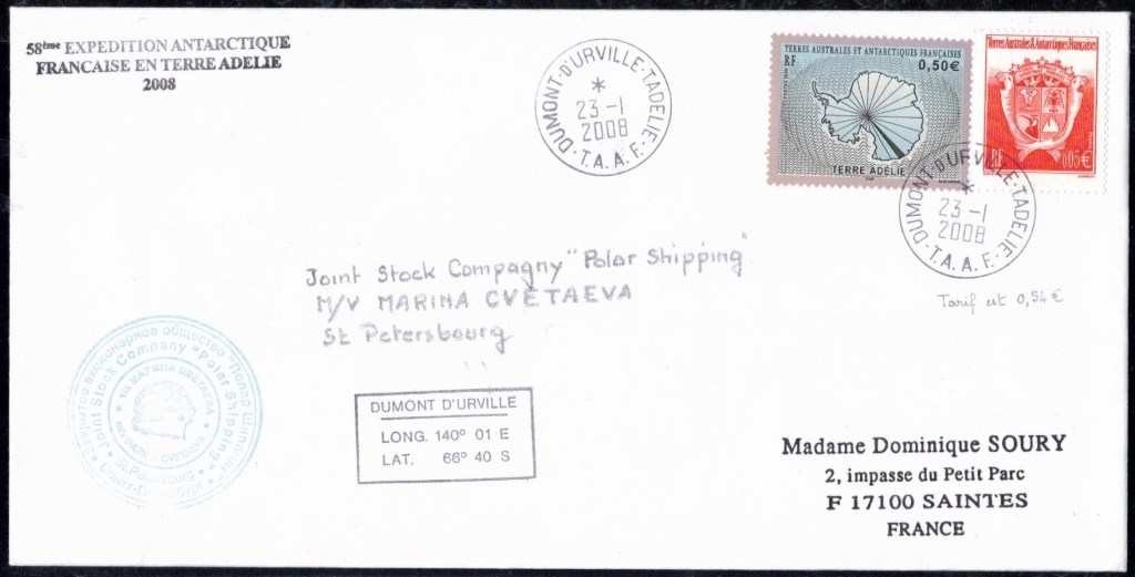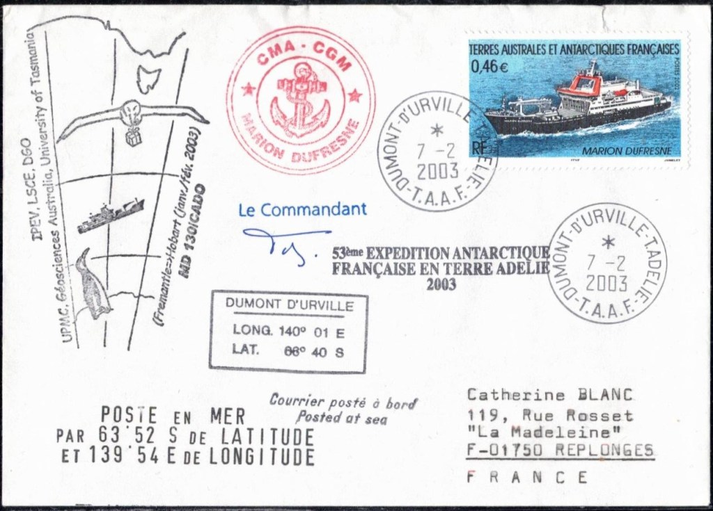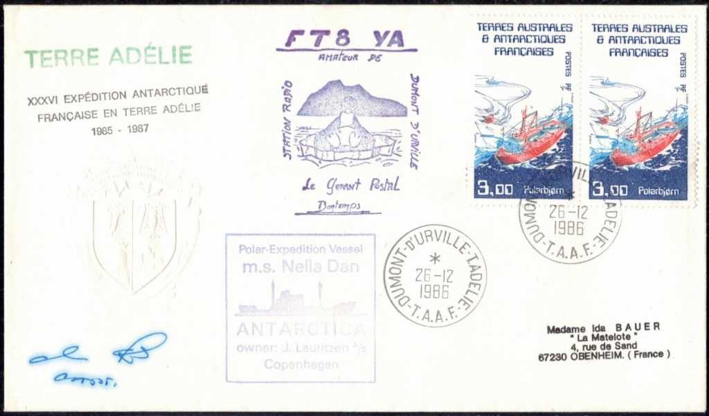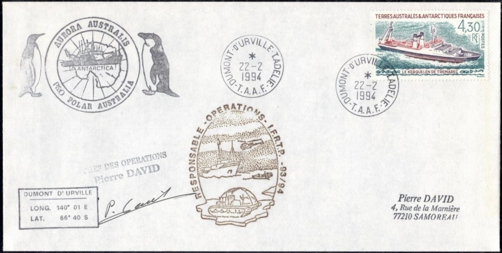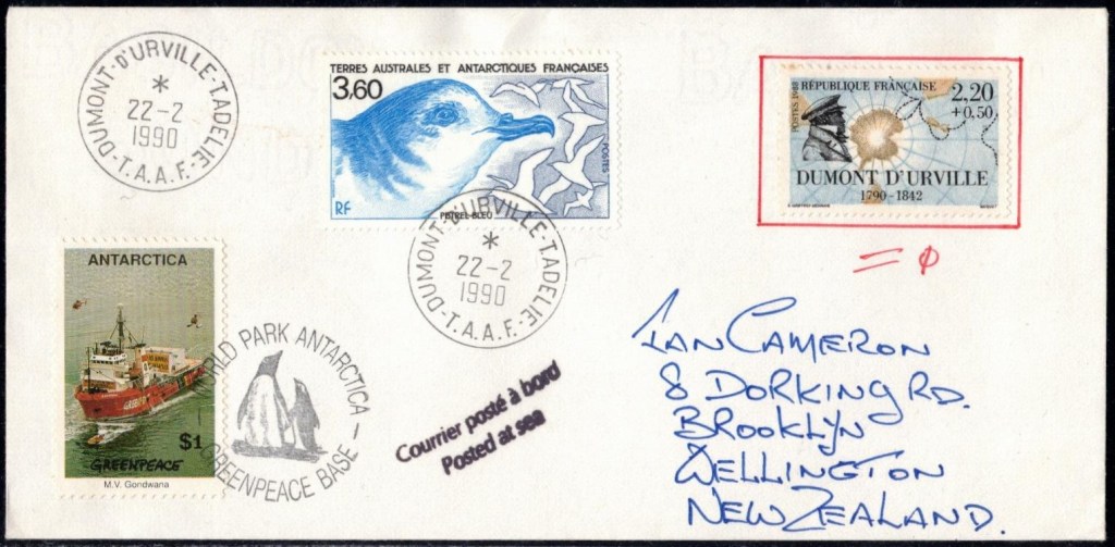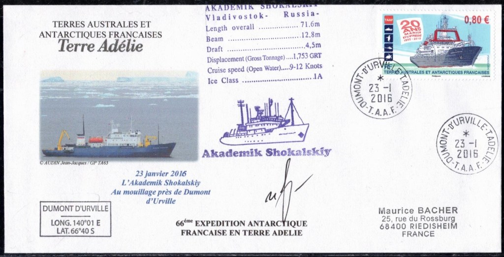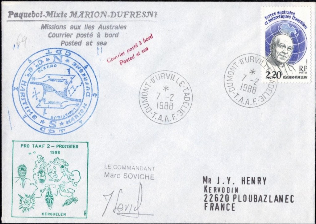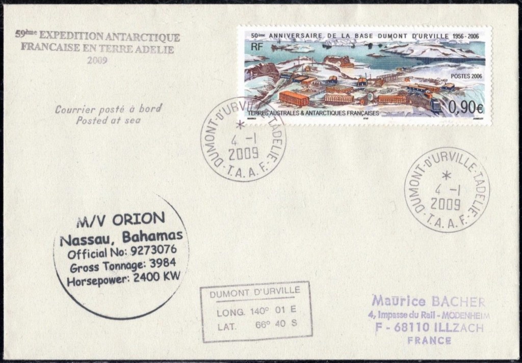 Lettre oblitérée lors du passage du navire soviétique Ob (voir missions glaciologiques Vostok)Lettre oblitérée lors du passage du navire US STATEN ISLAND et repartie par le Thala DanLettre oblitérée lors du passage du SV EXPLORA, navire de recherche géophysiqueLettre oblitérée lors du passage du MS LINDBLAD EXPLORER, navire de croisières Lettre oblitérée lors du passage du DICK SMITH EXPLORER le 8 février 1982Passage du Polar Star en mission d’inspection du respect du traité sur l’antarctique, terre adélie 28 janvier 1983Pli oblitéré à bord du Polar Star début février 1983 lors de sa mission d’inspectionLettre oblitérée lors du second passage du DICK SMITH EXPLORER le 1er janvier 1985Lettre oblitérée lors du passage du SOUTHERN QUESTPassage du Southern Quest en terre Adélie le 11 décembre 1985 (expédition Australienne) peu avant son naufrageLettre déposée et oblitérée lors du passage du Southern Quest à Dumont D’Urville avec retour par L’IcebirdLettre oblitérée lors du passage du navire allemand MV ICEBIRDPli du 3 janvier 1986 oblitéré lors du passage de l’Icebird et sa carte signée du commandantLettre oblitérée lors du passage du navire Danois MS NELLA DANLettre oblitérée lors du passage du premier passage du MARION DUFRESNE, habituel ravitailleur des îles australes françaisesAvec les cachets de la campagne océanographique objet de ce voyageCarte illustrée signée du commandant du Marion Dufresne en recto versoLettre oblitérée lors du passage du navire de Greenpeace lLettre oblitérée lors du passage du navire de Greenpeace le 14 janvier 1989Passage du navire de Greenpeace le 22 janvier 1990Lettre oblitérée lors du passage du MS FRONTIER SPIRIT, navire de croisièresLettre oblitérée lors du second passage de l’ICEBIRD le 2 novembre 1993Lettre oblitérée lors du passage du navire australien AURORA AUSTRALISNouveau passage d’inspection du navire US POLAR STAR le 17 février 1995Lettre oblitérée lors du premier passage du navire russe KAPITAN KHLEBNIKOVAvec erreur de date sur la flamme 31 décembre 1990Lettre oblitérée lors du second passage du navire russe KAPITAN KHLEBNIKOVLettre oblitérée lors du passage du navire russe AKADEMIC SHOKALSKILettre oblitérée lors du troisième passage du navire russe Kapitan Khlebnikov avec erreur sur l’un des timbres à datePassage du navire russe « Marina Svetaeva »