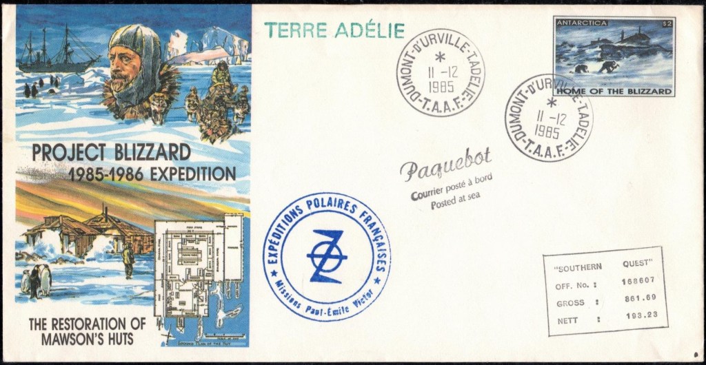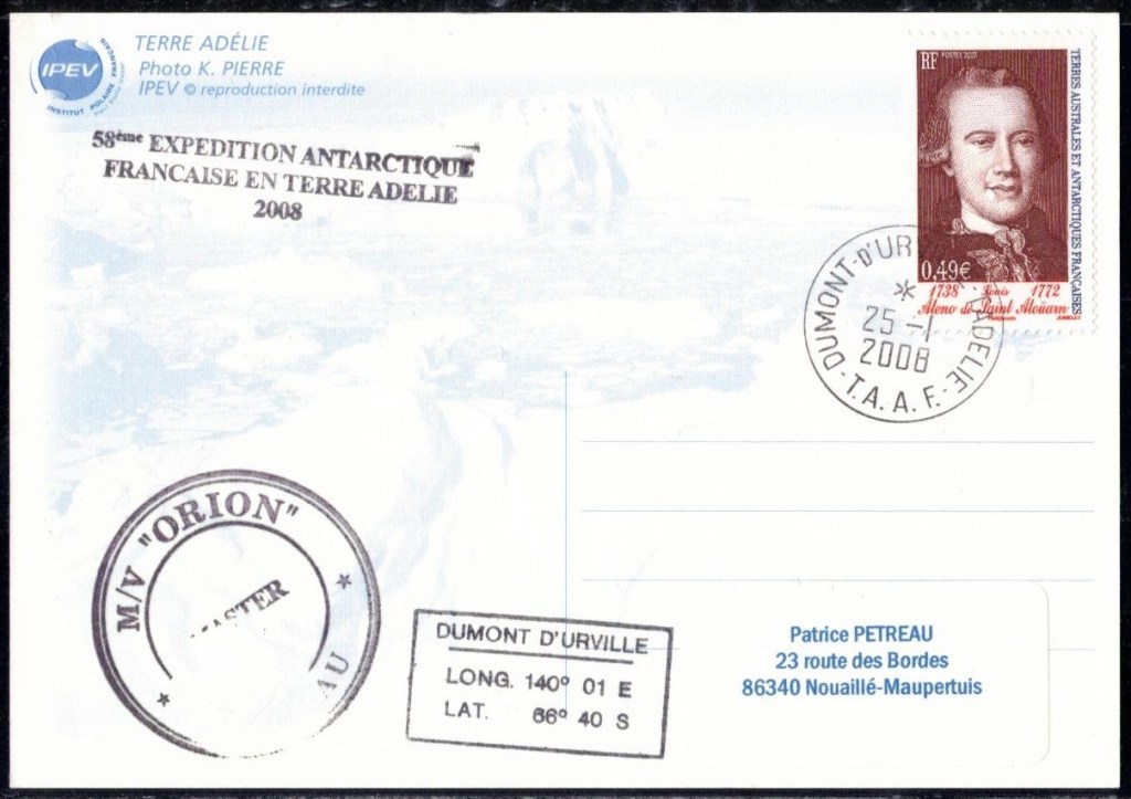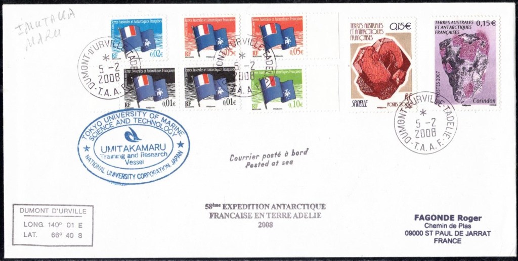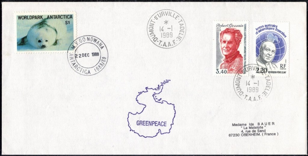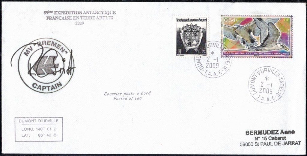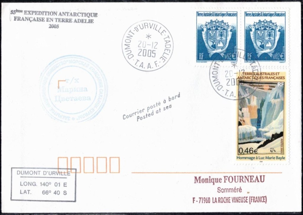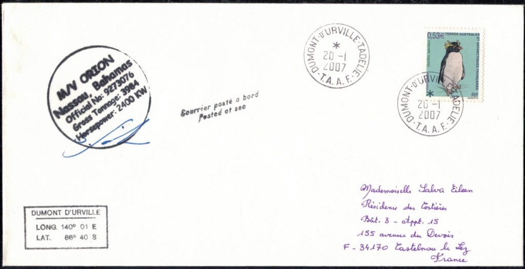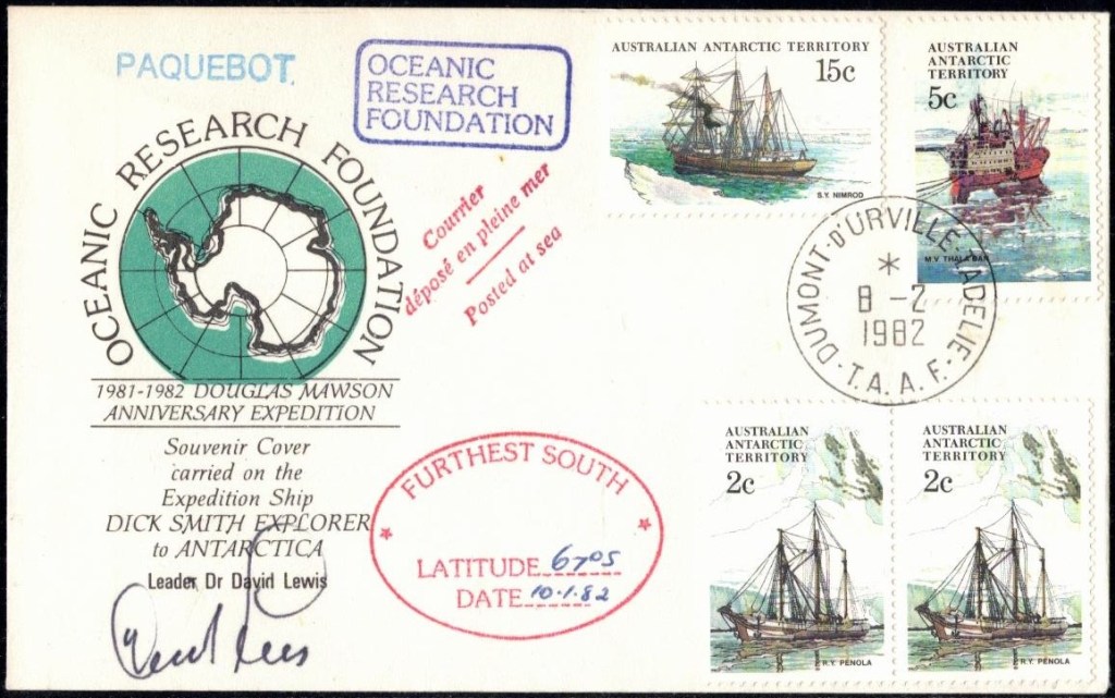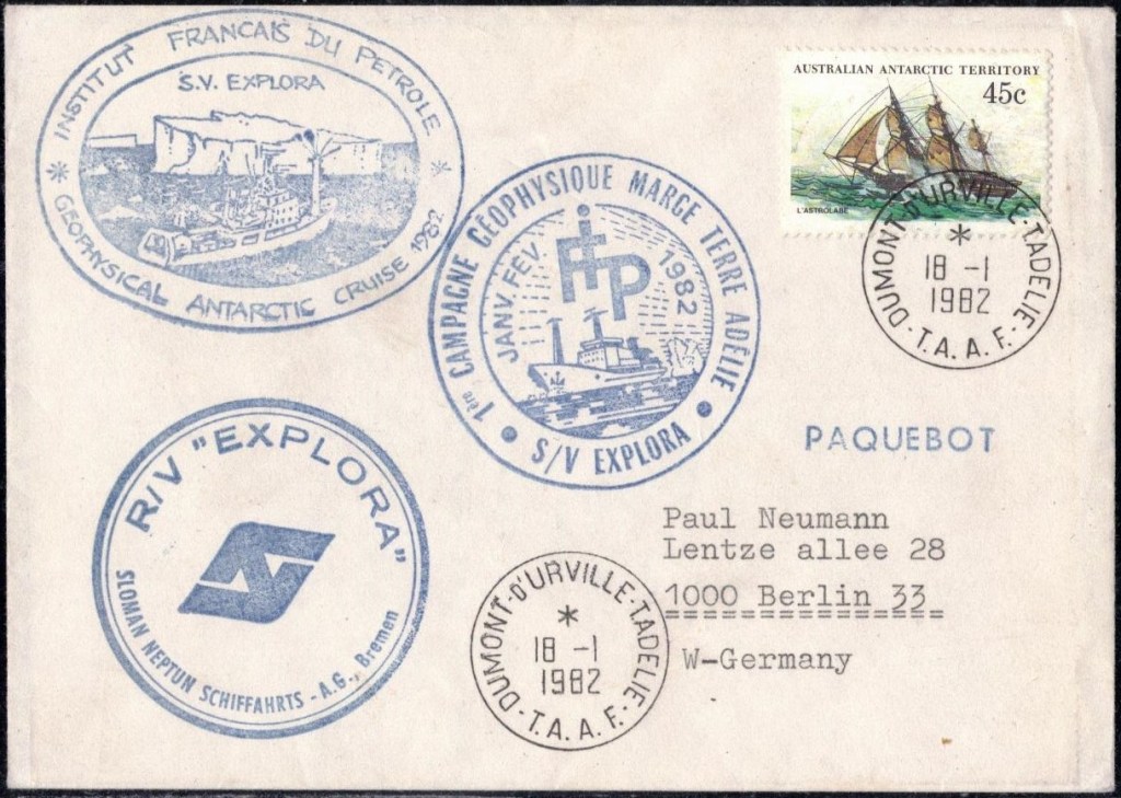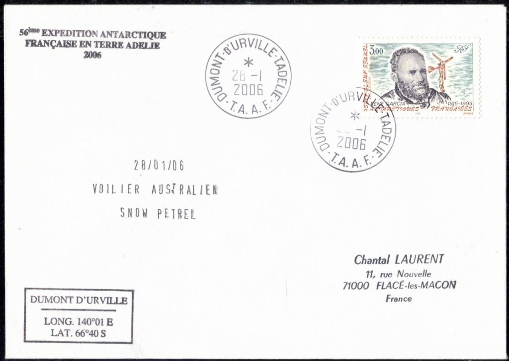 Lettre oblitérée lors du passage du navire soviétique Ob (voir missions glaciologiques Vostok)Lettre oblitérée lors du passage du navire US STATEN ISLAND et repartie par le Thala DanLettre oblitérée lors du passage du SV EXPLORA, navire de recherche géophysiqueLettre oblitérée lors du passage du MS LINDBLAD EXPLORER, navire de croisières Lettre oblitérée lors du passage du DICK SMITH EXPLORER le 8 février 1982Passage du Polar Star en mission d’inspection du respect du traité sur l’antarctique, terre adélie 28 janvier 1983Pli oblitéré à bord du Polar Star début février 1983 lors de sa mission d’inspectionLettre oblitérée lors du second passage du DICK SMITH EXPLORER le 1er janvier 1985Lettre oblitérée lors du passage du SOUTHERN QUESTPassage du Southern Quest en terre Adélie le 11 décembre 1985 (expédition Australienne) peu avant son naufrageLettre déposée et oblitérée lors du passage du Southern Quest à Dumont D’Urville avec retour par L’IcebirdLettre oblitérée lors du passage du navire allemand MV ICEBIRDPli du 3 janvier 1986 oblitéré lors du passage de l’Icebird et sa carte signée du commandantLettre oblitérée lors du passage du navire Danois MS NELLA DANLettre oblitérée lors du passage du premier passage du MARION DUFRESNE, habituel ravitailleur des îles australes françaisesAvec les cachets de la campagne océanographique objet de ce voyageCarte illustrée signée du commandant du Marion Dufresne en recto versoLettre oblitérée lors du passage du navire de Greenpeace lLettre oblitérée lors du passage du navire de Greenpeace le 14 janvier 1989Passage du navire de Greenpeace le 22 janvier 1990Lettre oblitérée lors du passage du MS FRONTIER SPIRIT, navire de croisièresLettre oblitérée lors du second passage de l’ICEBIRD le 2 novembre 1993Lettre oblitérée lors du passage du navire australien AURORA AUSTRALISNouveau passage d’inspection du navire US POLAR STAR le 17 février 1995Lettre oblitérée lors du premier passage du navire russe KAPITAN KHLEBNIKOVAvec erreur de date sur la flamme 31 décembre 1990Lettre oblitérée lors du second passage du navire russe KAPITAN KHLEBNIKOVLettre oblitérée lors du passage du navire russe AKADEMIC SHOKALSKILettre oblitérée lors du troisième passage du navire russe Kapitan Khlebnikov avec erreur sur l’un des timbres à datePassage du navire russe « Marina Svetaeva »