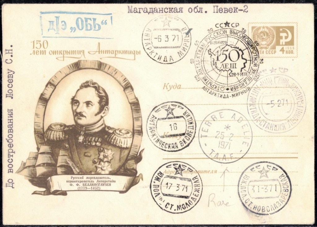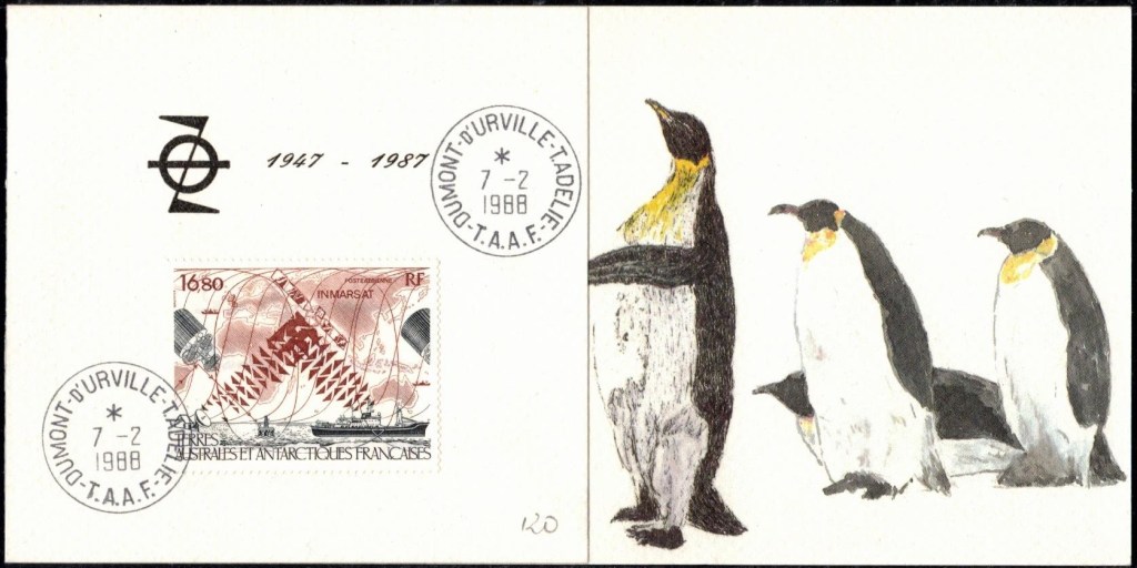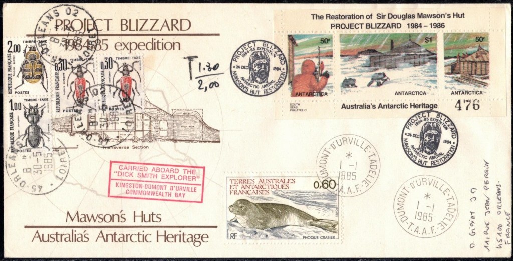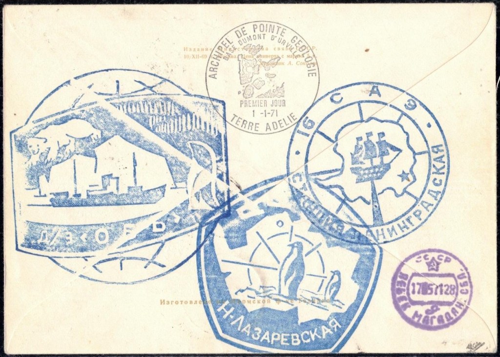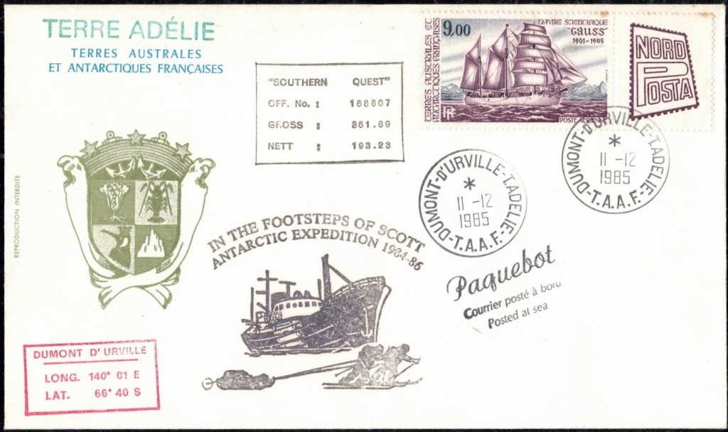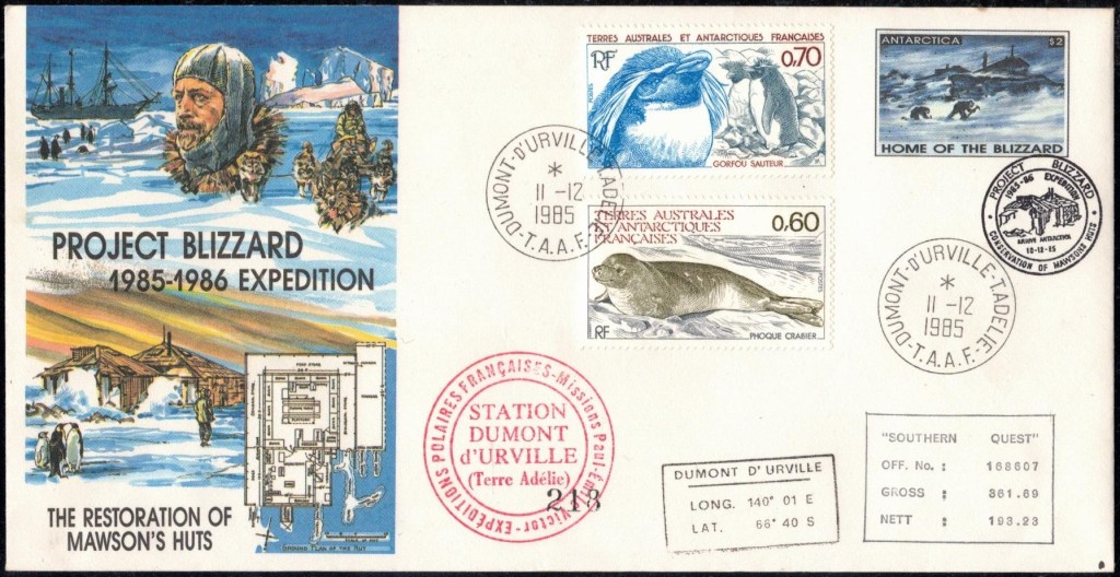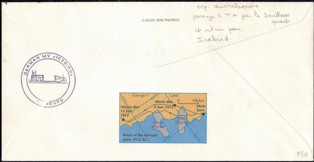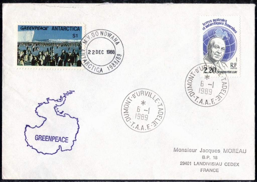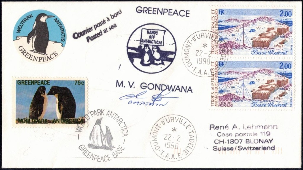 Lettre oblitérée lors du passage du navire soviétique Ob (voir missions glaciologiques Vostok)Lettre oblitérée lors du passage du navire US STATEN ISLAND et repartie par le Thala DanLettre oblitérée lors du passage du SV EXPLORA, navire de recherche géophysiqueLettre oblitérée lors du passage du MS LINDBLAD EXPLORER, navire de croisières Lettre oblitérée lors du passage du DICK SMITH EXPLORER le 8 février 1982Passage du Polar Star en mission d’inspection du respect du traité sur l’antarctique, terre adélie 28 janvier 1983Pli oblitéré à bord du Polar Star début février 1983 lors de sa mission d’inspectionLettre oblitérée lors du second passage du DICK SMITH EXPLORER le 1er janvier 1985Lettre oblitérée lors du passage du SOUTHERN QUESTPassage du Southern Quest en terre Adélie le 11 décembre 1985 (expédition Australienne) peu avant son naufrageLettre déposée et oblitérée lors du passage du Southern Quest à Dumont D’Urville avec retour par L’IcebirdLettre oblitérée lors du passage du navire allemand MV ICEBIRDPli du 3 janvier 1986 oblitéré lors du passage de l’Icebird et sa carte signée du commandantLettre oblitérée lors du passage du navire Danois MS NELLA DANLettre oblitérée lors du passage du premier passage du MARION DUFRESNE, habituel ravitailleur des îles australes françaisesAvec les cachets de la campagne océanographique objet de ce voyageCarte illustrée signée du commandant du Marion Dufresne en recto versoLettre oblitérée lors du passage du navire de Greenpeace lLettre oblitérée lors du passage du navire de Greenpeace le 14 janvier 1989Passage du navire de Greenpeace le 22 janvier 1990Lettre oblitérée lors du passage du MS FRONTIER SPIRIT, navire de croisièresLettre oblitérée lors du second passage de l’ICEBIRD le 2 novembre 1993Lettre oblitérée lors du passage du navire australien AURORA AUSTRALISNouveau passage d’inspection du navire US POLAR STAR le 17 février 1995Lettre oblitérée lors du premier passage du navire russe KAPITAN KHLEBNIKOVAvec erreur de date sur la flamme 31 décembre 1990Lettre oblitérée lors du second passage du navire russe KAPITAN KHLEBNIKOVLettre oblitérée lors du passage du navire russe AKADEMIC SHOKALSKILettre oblitérée lors du troisième passage du navire russe Kapitan Khlebnikov avec erreur sur l’un des timbres à datePassage du navire russe « Marina Svetaeva »