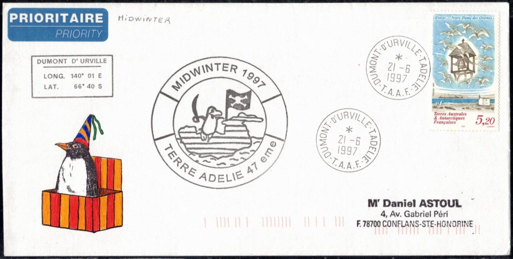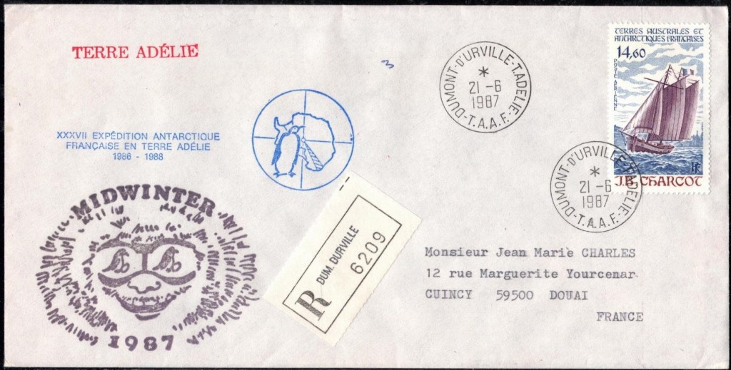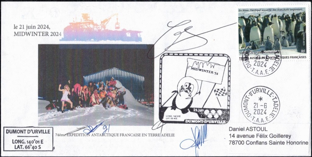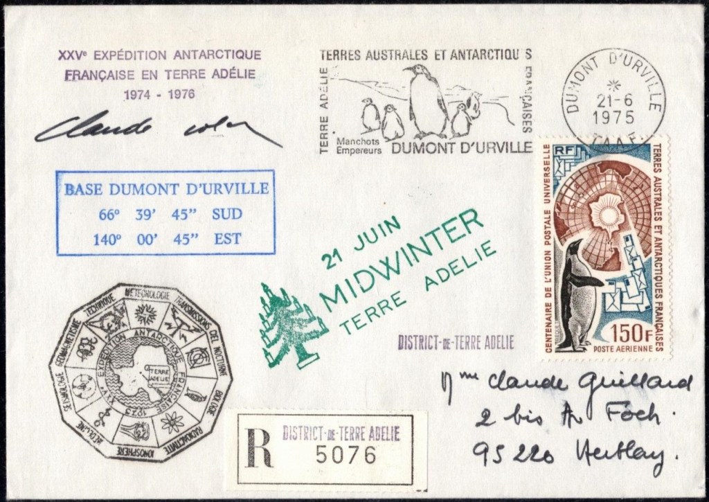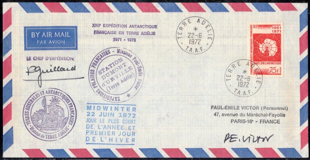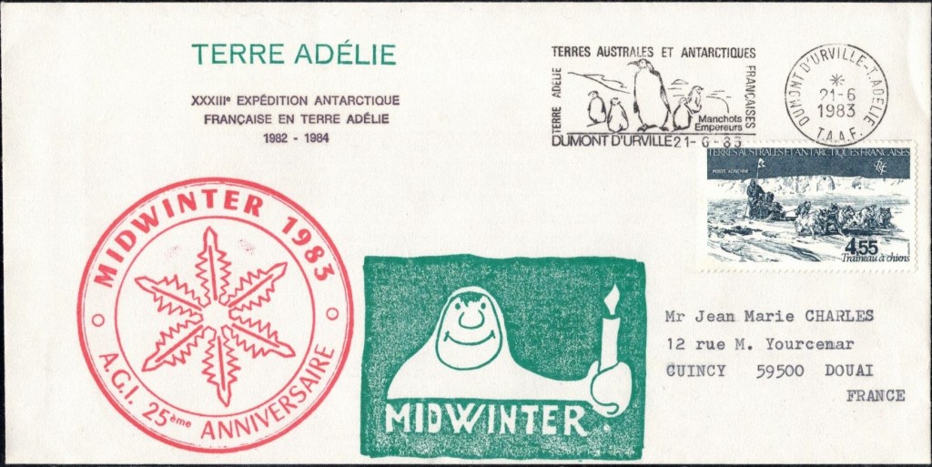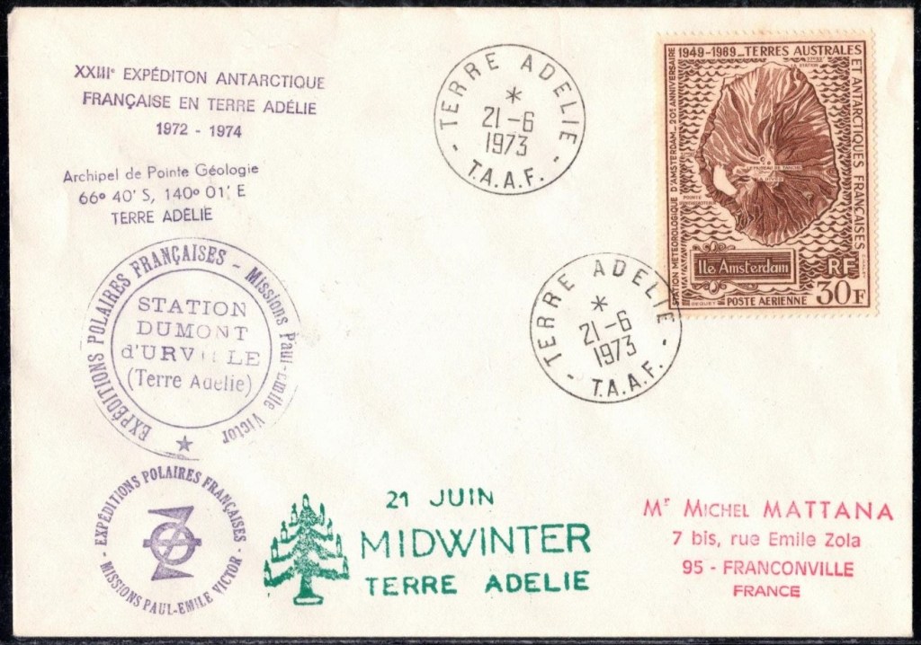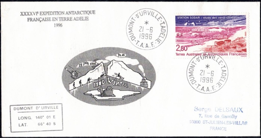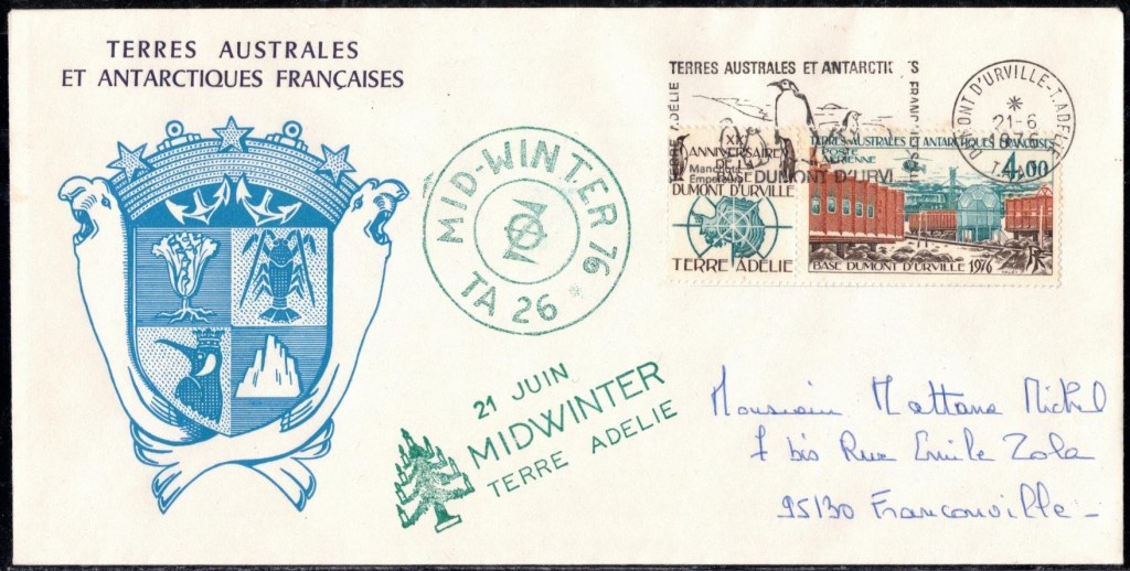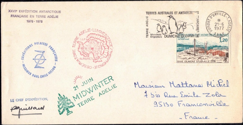 MIDWINTER Carte photographique des TAAF oblitérée du 21 juin 1969 Midwinter 1980 sur pli de service (non affranchi)