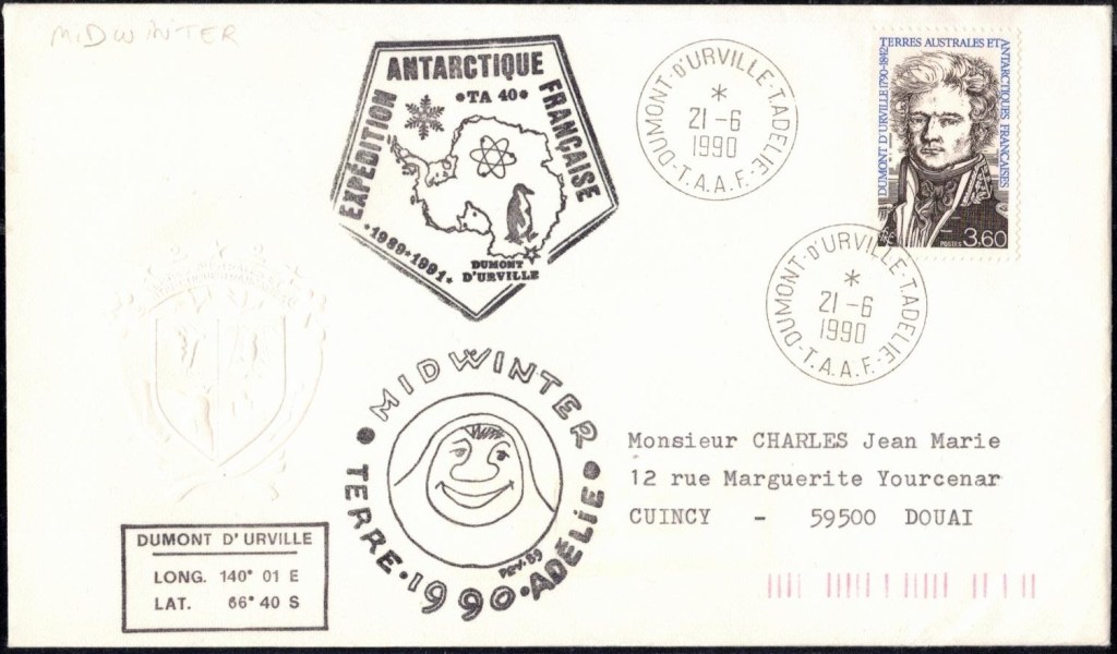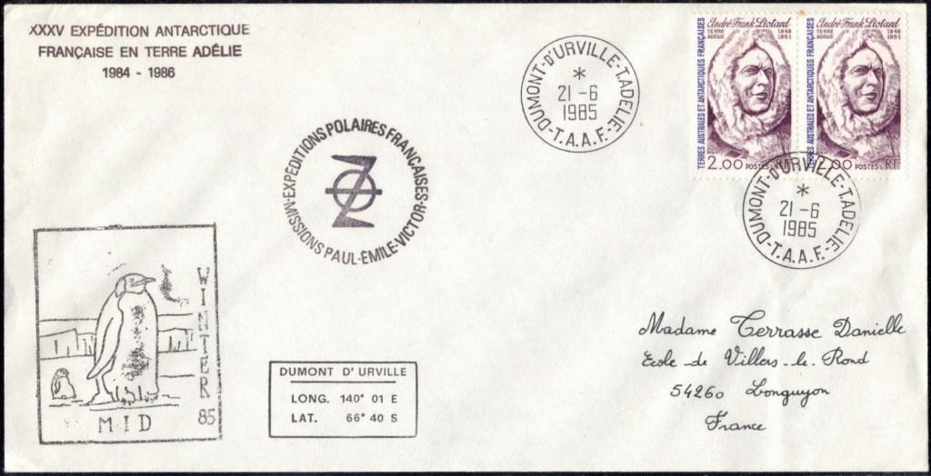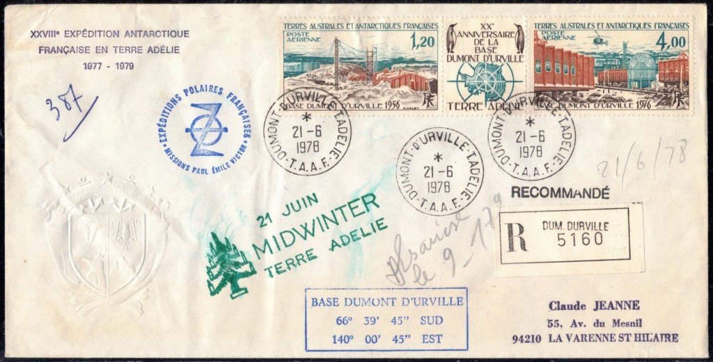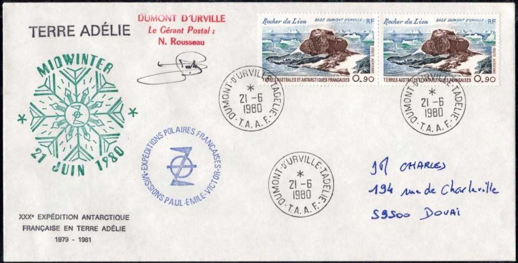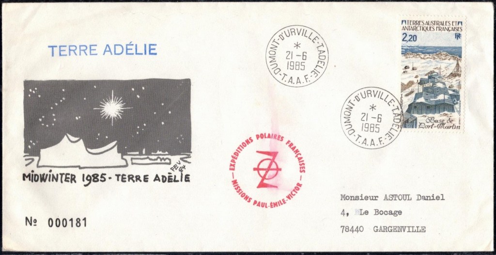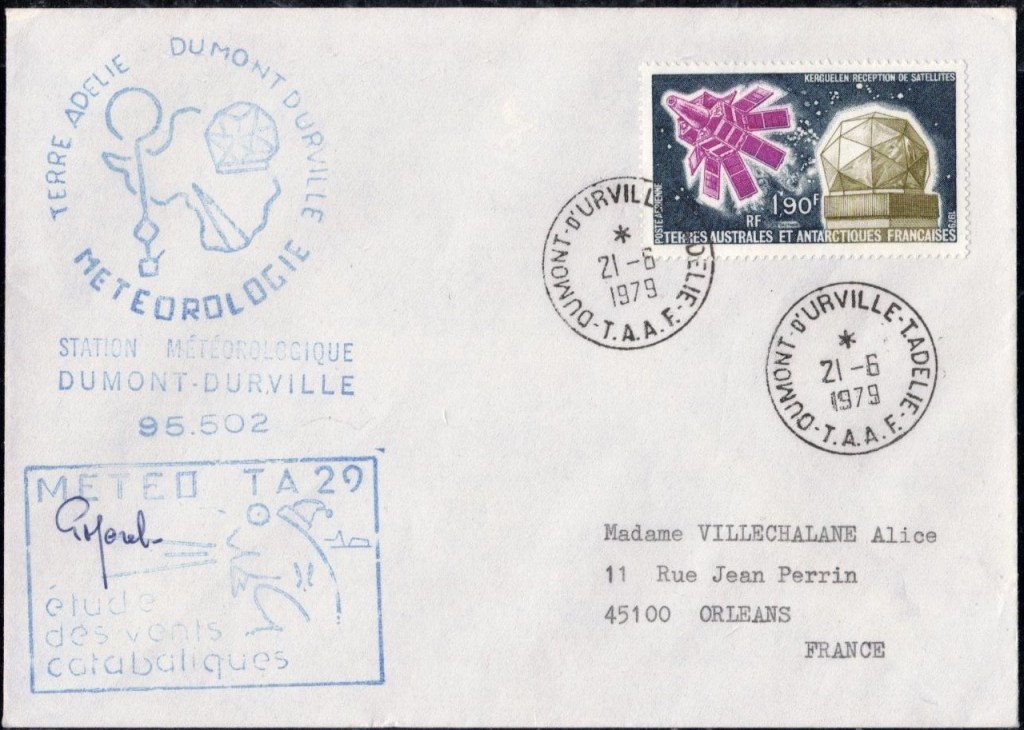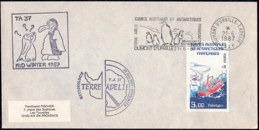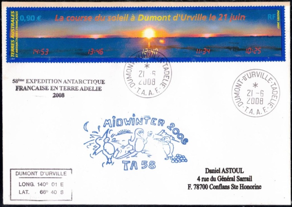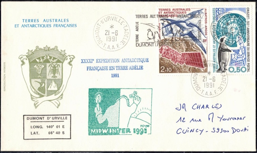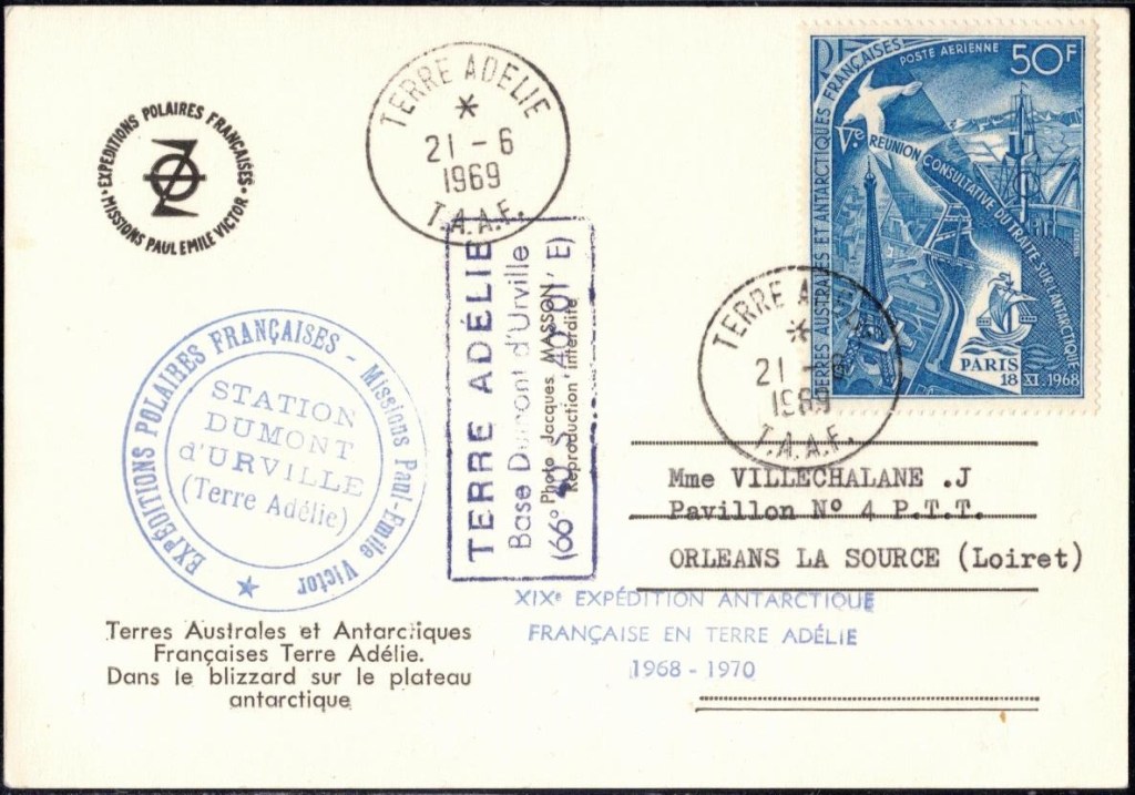 MIDWINTER Carte photographique des TAAF oblitérée du 21 juin 1969 Midwinter 1980 sur pli de service (non affranchi)