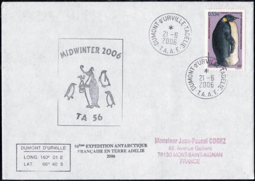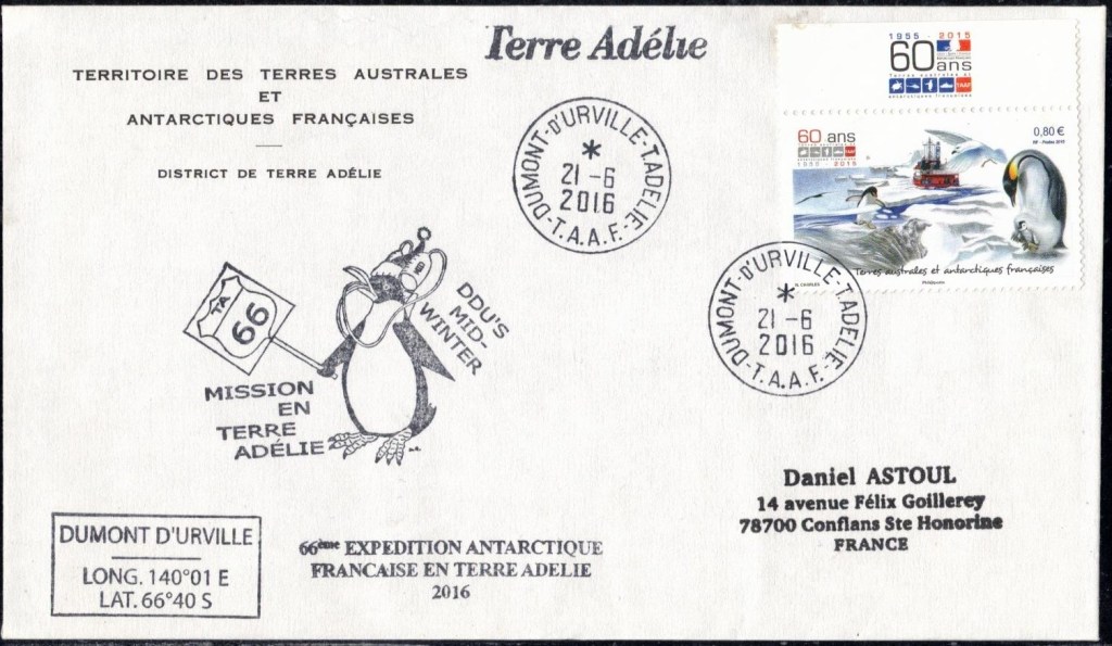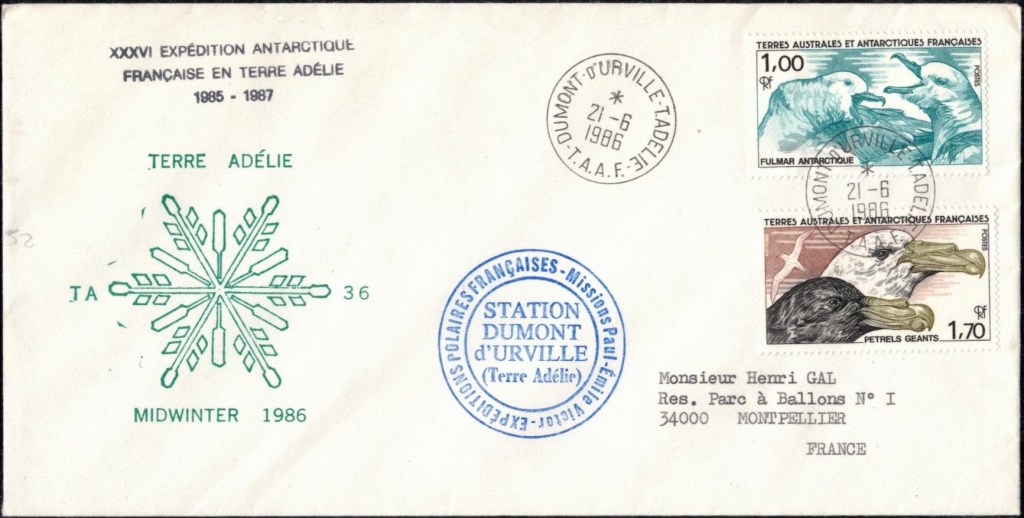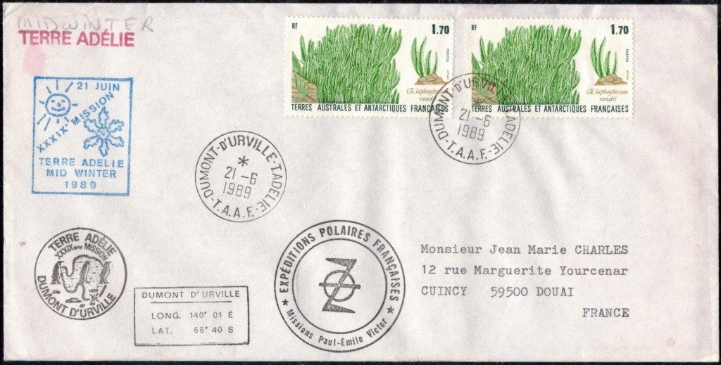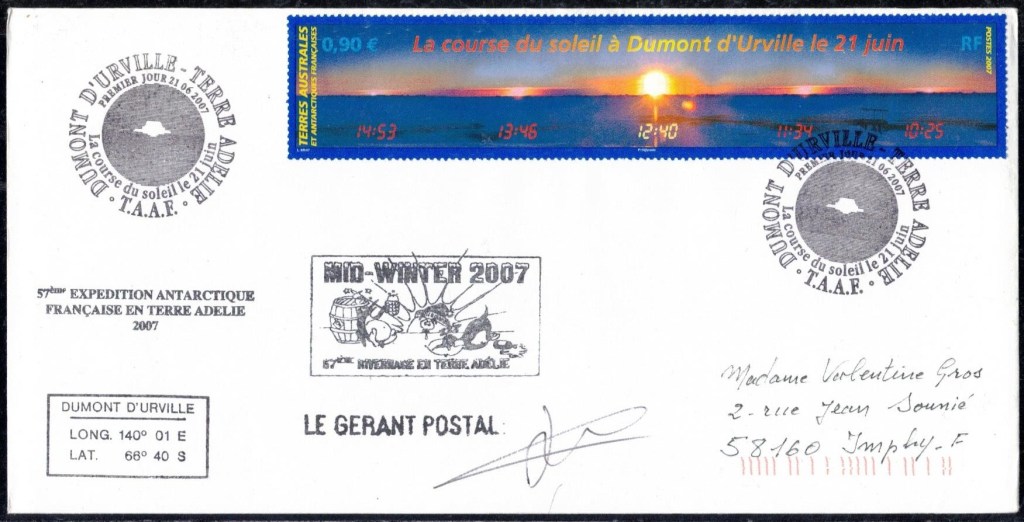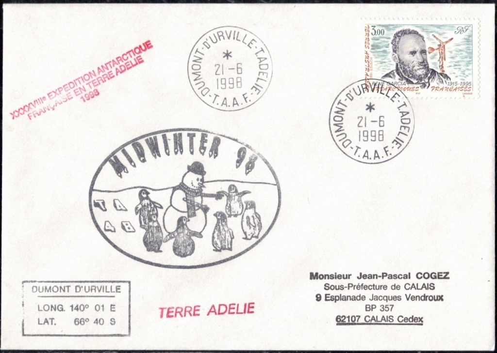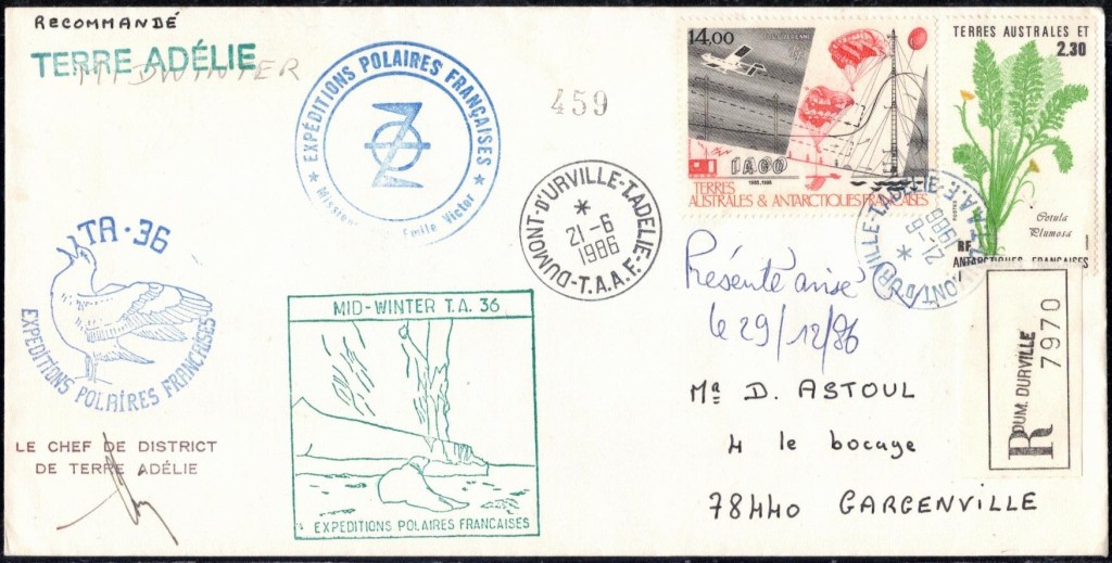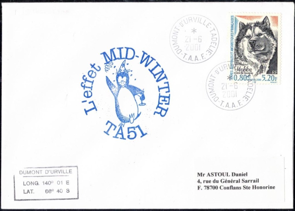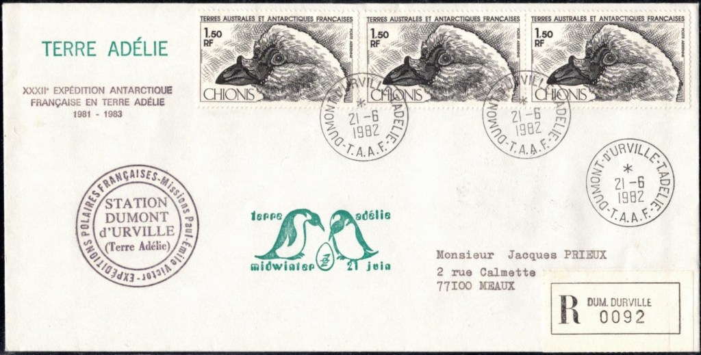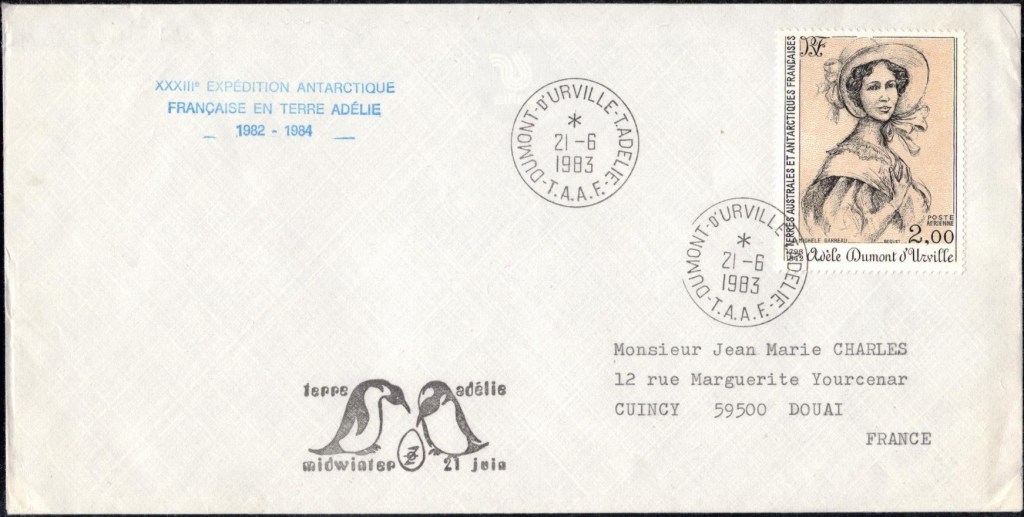 MIDWINTER Carte photographique des TAAF oblitérée du 21 juin 1969 Midwinter 1980 sur pli de service (non affranchi)