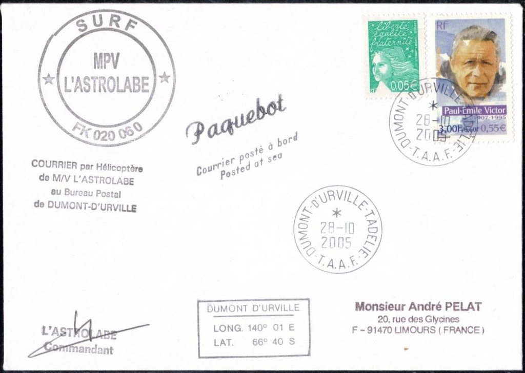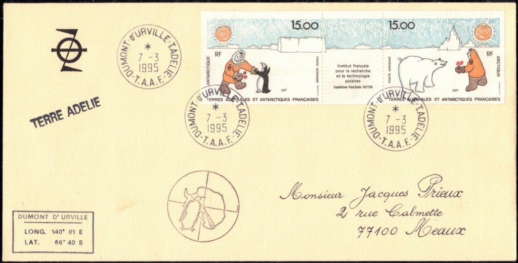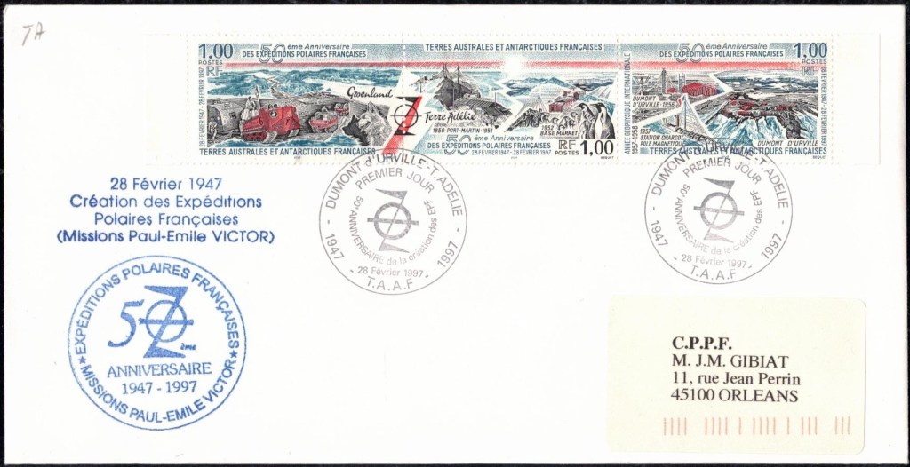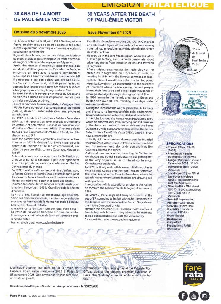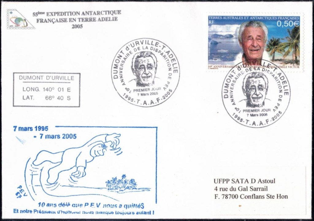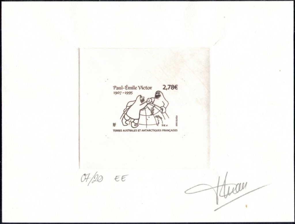 Timbre à date du jour de la mort de PEV sur timbres institut français pour la recherche et la technologie polaire Epreuve d’artiste du timbre hommage à PEV à Dumont d’Urville50ème anniversaire des EPF sur timbres hommage à PEV décédé en 1995Epreuve d’essai signée par l’artiste du timbre hommage à PEV 2025Feuille du timbre Polynésie 2025 hommage à PEV signée par sa fille Daphné et cachet premier jour