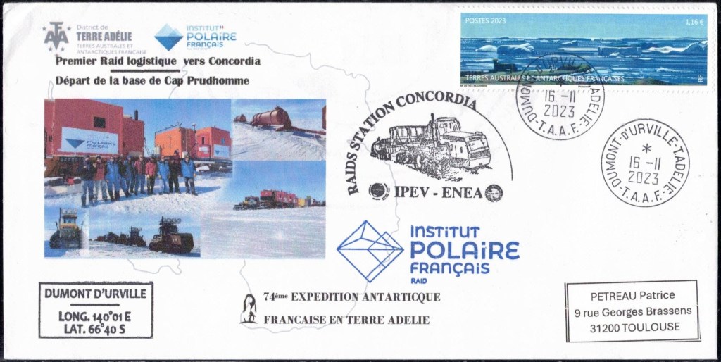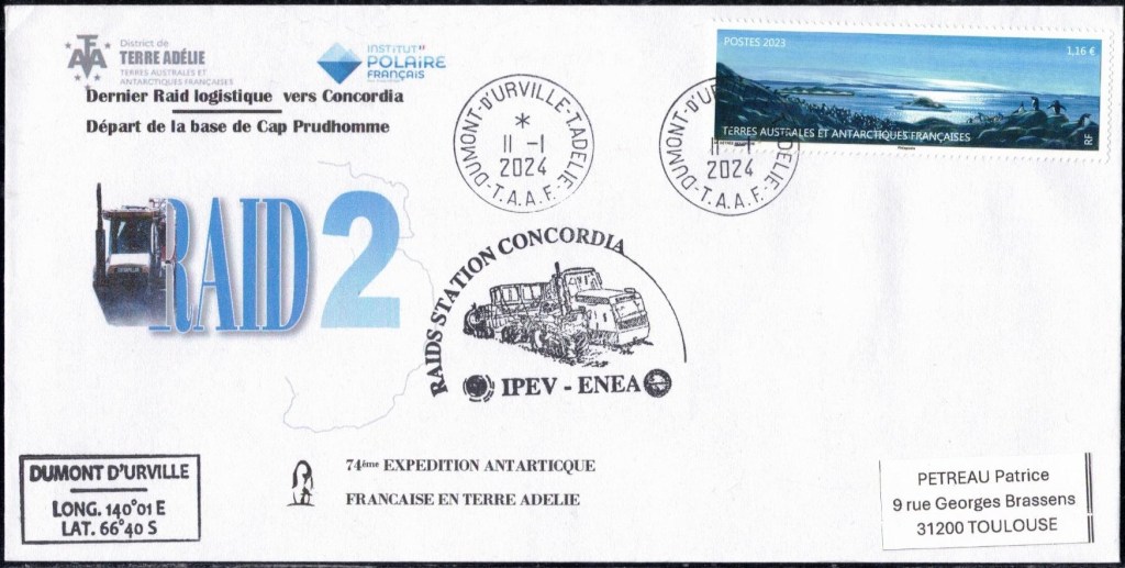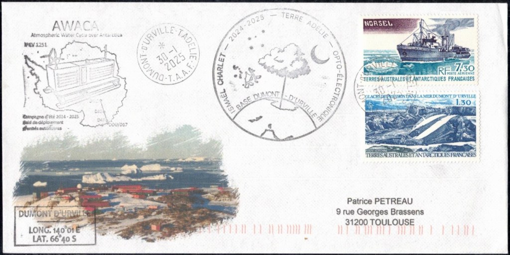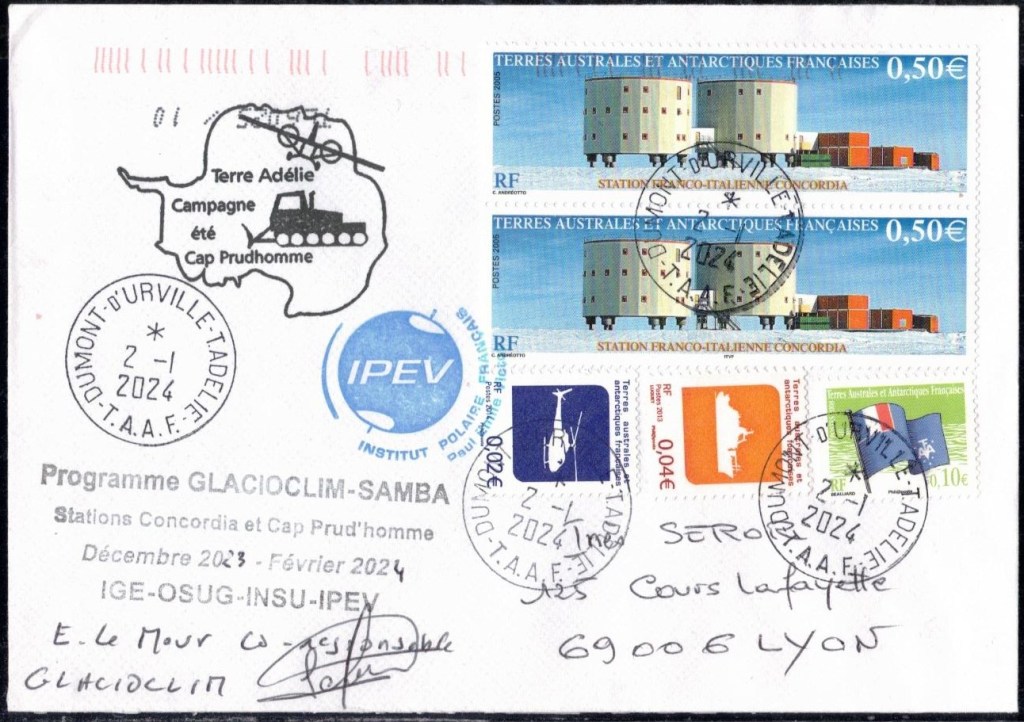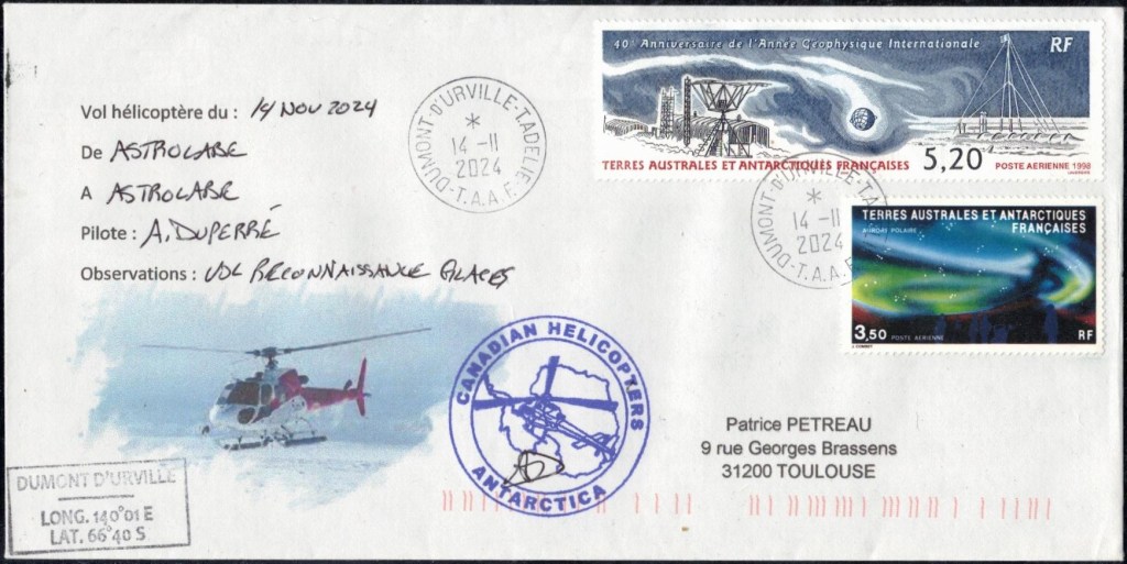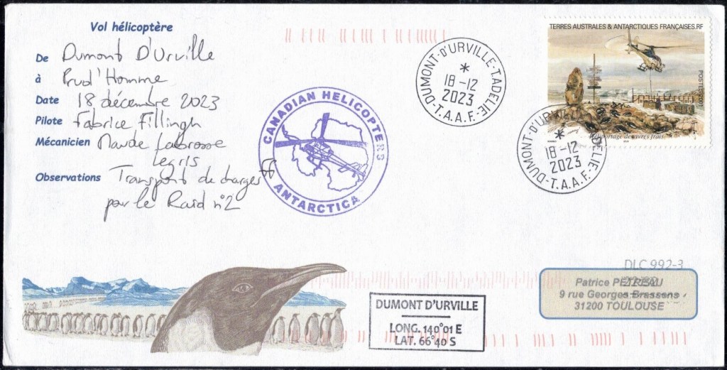 SAISON 2023 – 2024 Vol hélicoptère préparation du raid AWACA Cachet du raid AWACA (atmospheric water cycle over antarctica), raid de déploiement d’unités autonomes